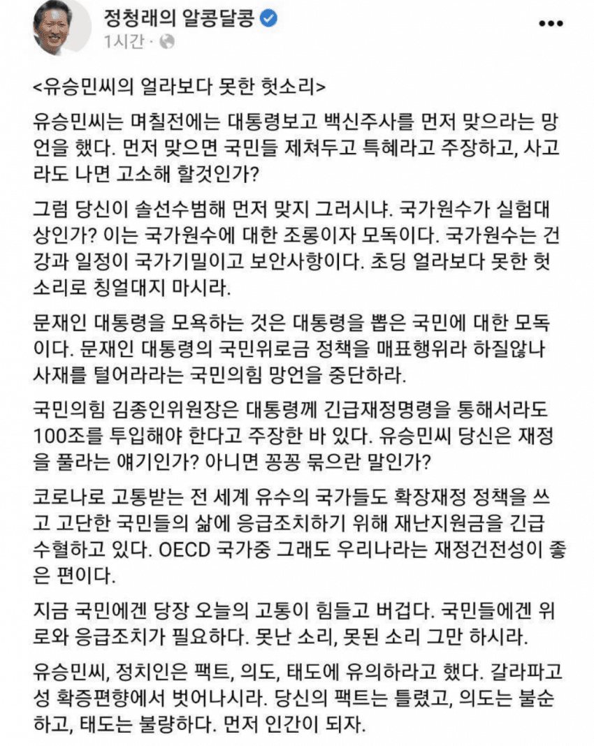 그러자 더불어민주당 정청래 의원은 21일 “대통령이 백신 주사를 먼저 맞으라는 건 ‘초딩 얼라’보다 못한 헛소리”라며