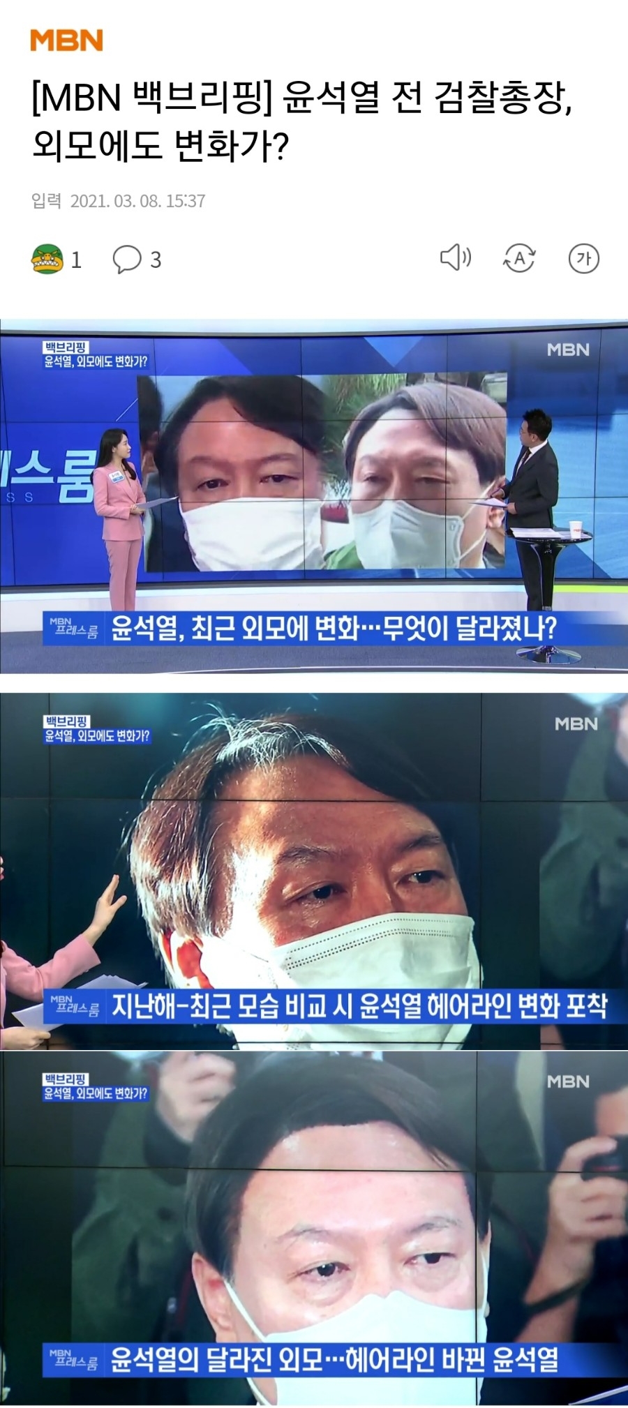 https://news.v.daum.net/v/20210308094628358 1년6개월 전 업로드된 윤석열 전 검찰총장에 대한 사주풀이 글이 눈길을 모으고 있습니다. 윤 전 총장의 사주에 대해서는 "1960년 12월18일생으로 나왔는데 음력이 아닌 양력일 경우 권부에 진출할 만한 그릇을 지니고 있으므로, 양력 12월18일 태어난 사주라고 가늠할 수 있다"고 설명했습니다. 또한 그는 "윤석열은 그릇이 매우 큰 사주다. 최고위 권력까지 갈 수 있는 형국이다. 어쩌면 검찰총장이 아니라 그보다 더 놓은 자리도 갈 수 있는 사주"라고 적었습니다. 그러면서 "윤석열 사주는 허신(虛神, 보이지 않는 것을 불러오는 기운)으로 높이 출세하는 사주"라며 "경자년(2020년)은 지위가 위태로워지고, 격랑에 휘말리게 되며 대운과 세운이 모두 충돌하니 온갖 논란의 대상이 될 듯하다"고 추정했습니다. 윤석열 전 검찰총장, 외모에도 변화가? https://news.v.daum.net/v/20210308153728626 【 앵커멘트 】 윤석열 전 총장, 최근에 외모에도 큰 변화가 생겼다고 하는데요. 정치를 염두에 둔 변신일까요? 윤지원 기자와 백브리핑에서 이 얘기 해보겠습니다. 【 질문1 】 윤 기자, 윤 전 총장 외모가 어떻게 달라졌다는 건가요? 【 기자 】 두 가지 영상을 준비해 봤습니다. 지금 보시는 건 지난해 12월 업무 복귀 당시 기자들과 만난 모습이고요, 이 영상은 최근 사퇴 당시의 모습입니다. 앵커께서는 차이점을 발견하셨나요? 【 질문2 】 글쎄요, 머리 부분이 좀 바뀐 거 같기도 하고요? 【 기자 】 네, 사진으로 보면 변화가 더 뚜렷한데요, 두 사진을 비교해 보면 헤어라인과 이마 부분의 경계가 눈에 띄게 달라졌습니다. 젊은 느낌을 내기 위해 헤어라인에 신경을 쓴 것으로 보입니다. 어디 이름없는 신문사의 지라시 기사가 아닙니다. mbn 뉴스입니다. 종편이 윤석열 밀어주기로 나섰나보네요. "윤석열이 만난 與 거물 정치인은 김한길"..제3지대 조언 들었나 https://news.v.daum.net/v/20210307230557526 윤석열 전 검찰총장의 정치 행보에 관심이 집중되는 가운데 윤 전 총장이 '반문(反문재인) 성향의 여권 거물 정치인'을 만난 것으로 알려져 관심이 집중되고 있다. 7일 여권에 따르면 일부 언론을 통해 윤 전 총장이 사퇴하기 며칠 전 만난 것으로 보도된 '반문 성향 여권 정치인'은 김한길 전 민주당 대표인 것으로 알려졌다. 윤 전 총장이 김 전 대표와 접촉한 구체적 배경에 대해선 알려지지 않고 있어 예단하기는 어렵지만, 김 전 대표의 정치 궤적을 감안하면 윤 전 총장이 향후 정치 행보를 시작할 경우 국민의힘보다는 제3지대를 염두에 두고 있는 게 아니냐는 관측에 더욱 힘이 실리게 됐다. 윤석열이 김한길도 만났다고 하니 '제3지대' 영역으로 정계 진출하려나 보네요. 0
