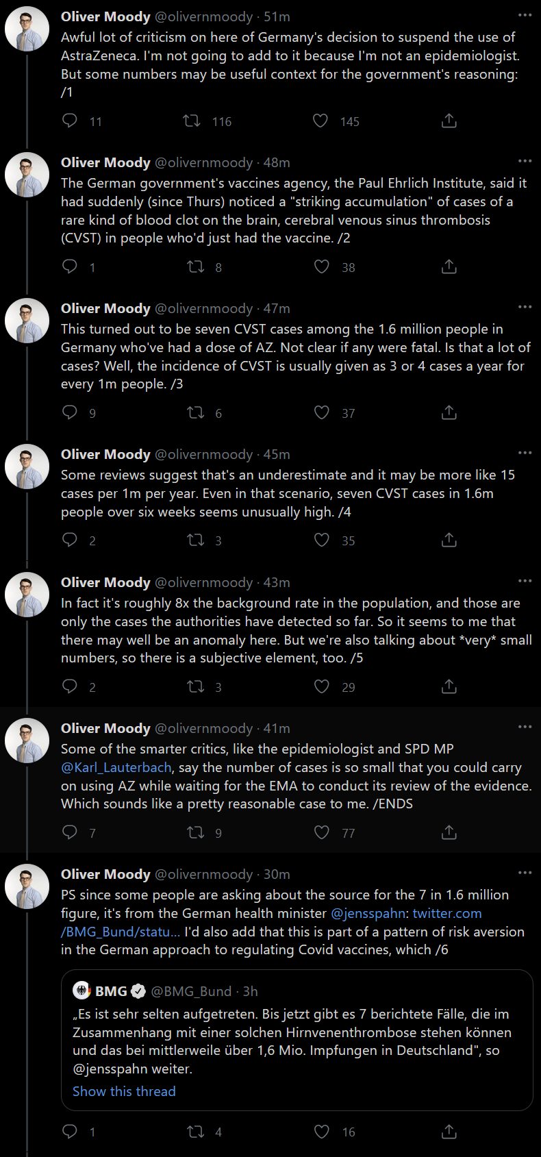WHO(세계보건기구)와 EMA(유럽의약품청), MHRA(영국의약품건강관리제품규제청)는 백신과 혈전 형성 사이 인과관계가 없다고 했고, 아스트라제네카 측에서도 문제없다고 직접 성명을 냈었습니다만, 유럽 쪽 분위기가 사태 초기보다 안 좋네요.  주말 사이에 각국의 자세가 많이 바뀌었습니다.