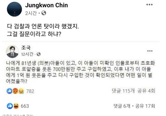 Subject   조국 "내가 웃돈 주고 아파트 샀다면"..진중권 "檢·언론탓 했겠지"