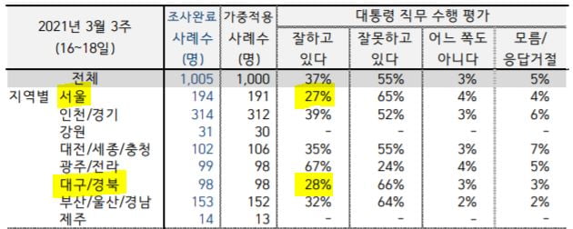 | Subject | 文대통령 서울 지지율 27% 전국 최저…TK보다도 낮다 |