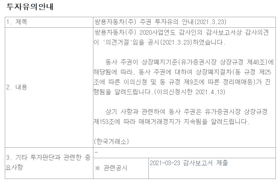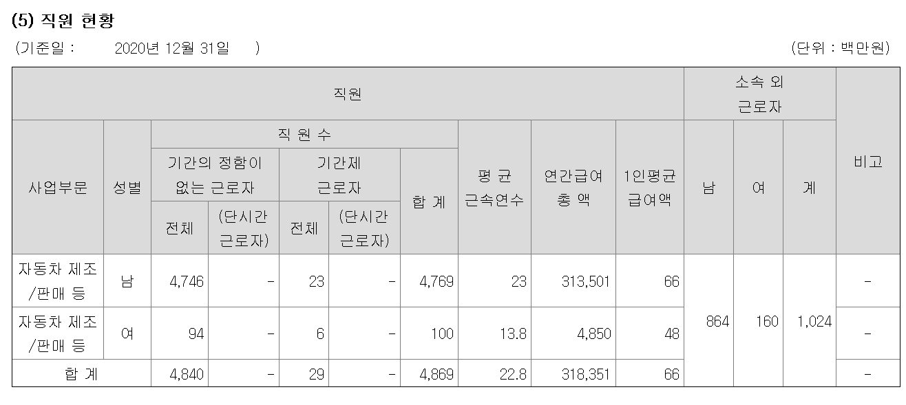 https://www.yna.co.kr/view/AKR20210323149051003 이런저런 일이 많았던 쌍용차였는데, 결국 감사 의견 거절 받았고, 상장폐지 문턱에 이르렀습니다. 작년 기준으로 쌍용차 직원 수가 5천명 조금 안 되고, 쌍용차에 사실상 전적으로 매출을 의존하는 협렵업체가 3개사, 쌍용차에 50% 이상 매출 의존하는 곳이 32개사라고 했었습니다. 직원 현황은 오늘 공시된 사업보고서에서 발췌. 0