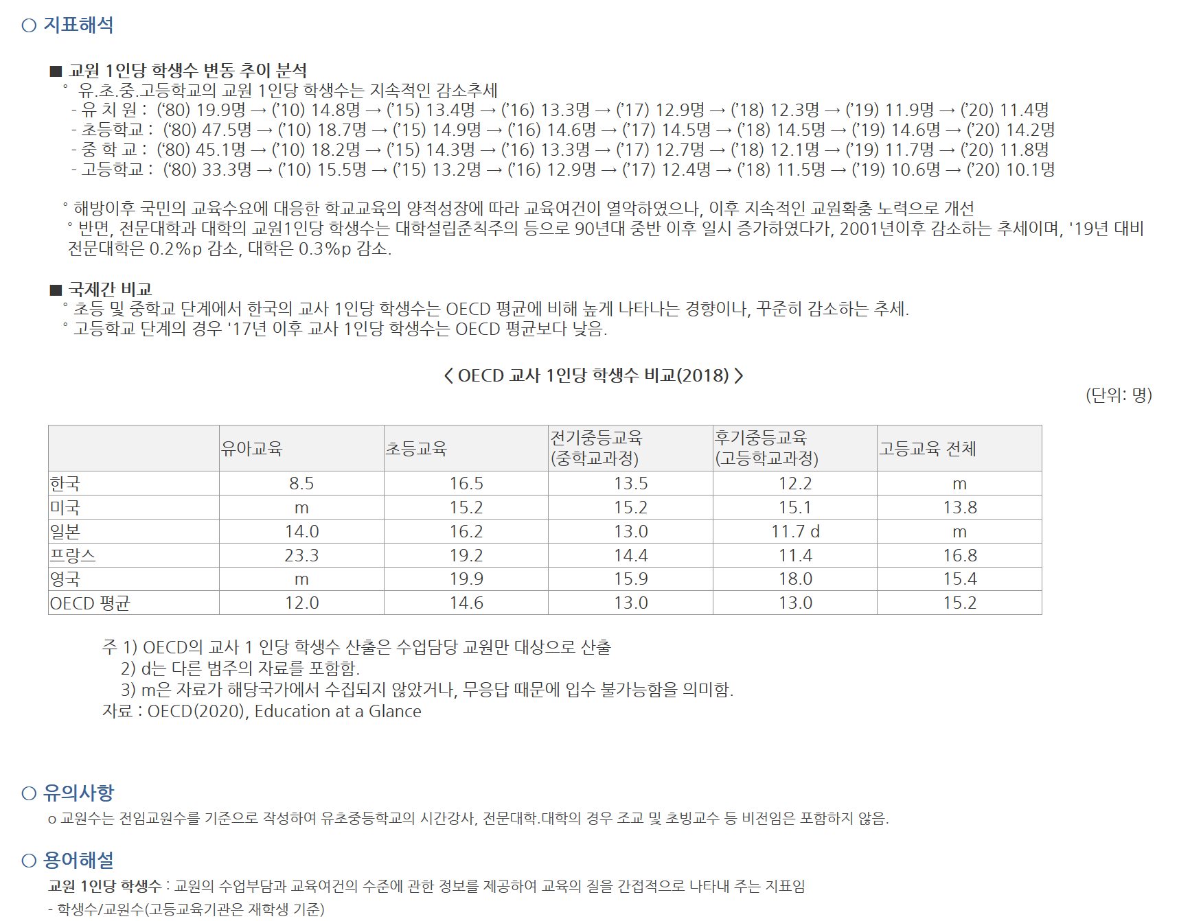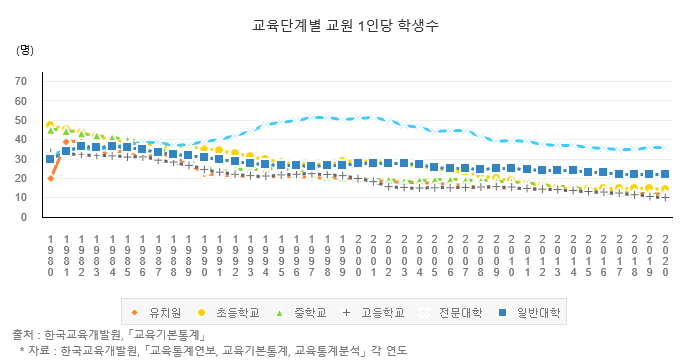 저는 중등교육 때 반 번호가 60번 넘어가던 때도 있었는데, 이제는 학급당 학생 수는 아니지만 교원 1인당 학생수가 어느 사이 10명까지 떨어졌군요. 찾아보니 고등학교 기준으로 2000년에 교원 1인당 학생수가 19.9명이었네요. 20년 사이 절반 수준으로 떨어졌습니다.