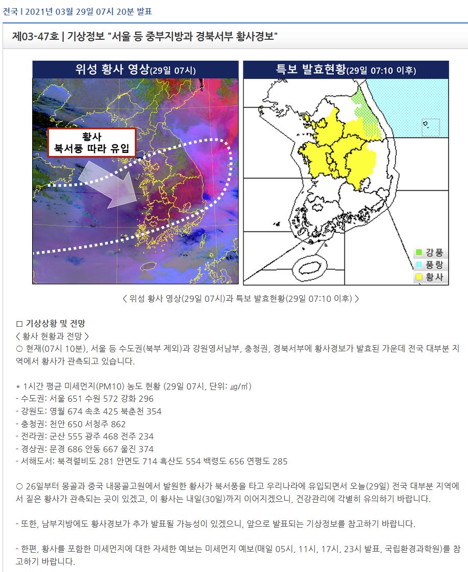 https://www.yna.co.kr/view/AKR20210329015500530 http://www.airkorea.or.kr/web/dustForecast?pMENU_NO=113 5년 만의 황사경보라고 합니다. 가능하면 밖에 나가지 않는 것이 좋겠습니다. 3