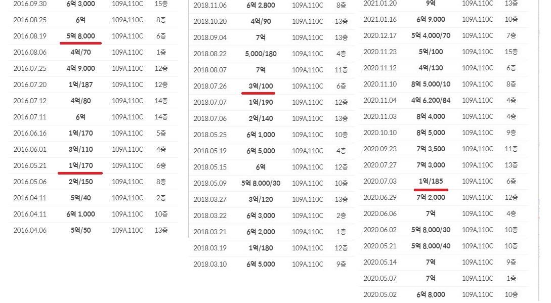 빨간줄 친 부분이 해당 아파트 6층, 박의원의 집으로 추측되는 집입니다. 2016년에는 5억 8천 쪽인지 1억/170만 쪽인지 알 수 없고, 2018년 7월에 3억/100만 원 거래가 있으니 여기가 확실히 박의원 집이라고 생각되네요. 2020년 1억/185도 확실하고. 이 언저리 거래금액을 보면 싸게 내놓았는지 아닌지 알 수 있겠죠.