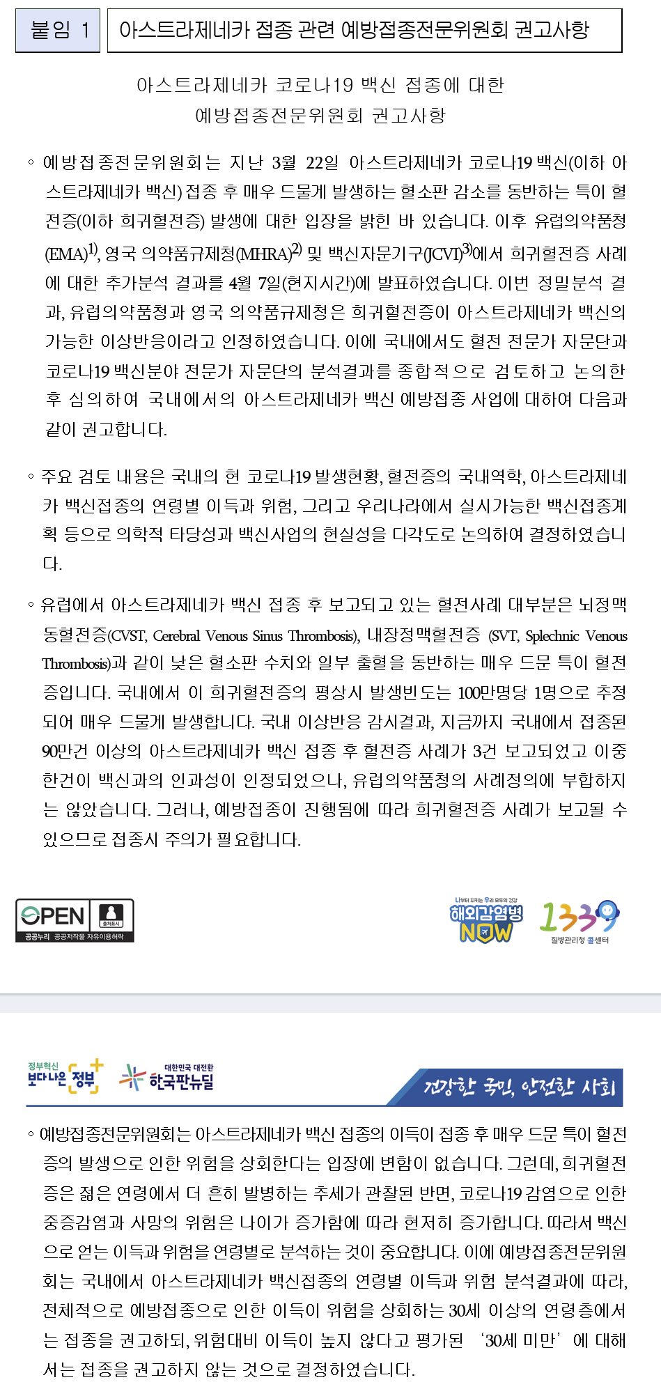위 표는 medium exposure를 기준으로 하고 있지만 같은 자료에서 low exposure일 때의 표를 보면 유일하게 30세 미만 그룹의 beneftis가 harms 보다 작습니다. 우리나라의 현재 감염 상황은 low exposure라고 볼 수 있기 때문에 아마도 이걸 기준으로 삼지 않았을까 유추해 봅니다.
