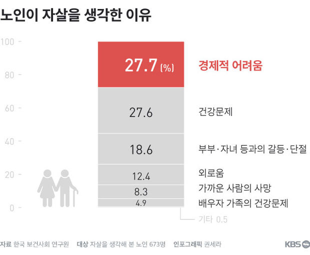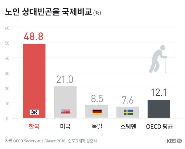https://news.v.daum.net/v/20210414141903198 [14일 고용노동부가 발표한 '2020년 산업재해 사고 사망 통계'에 따르면 지난해 산재 사고 사망자는 882명으로, 전년보다 27명(3.2%) 증가했다. 사망자를 연령대별로 보면 60세 이상이 347명(39.3%)으로 가장 많았다. 이어 50대(292명), 40대(137명), 30대(64명), 18∼29세(42명) 순이었다. 연령대가 높을수록 사망자가 많은 셈이다. 특히 60세 이상 사망자의 비율은 전년(33.3%)보다 급격히 증가했다. 고용부 관계자는 "산재 사망사고가 주로 건설업에서 발생하는데 건설 노동자의 고령화가 진행되면서 산재 사고 사망자 중 고령자의 비율도 높아진 것으로 보인다"고 말했다.] 트위터 눈팅하다가 본 뉴스입니다. OECD 1위였던 노인 자살율과 빈곤율도 생각나던. 짤은 좀 된거입니다 ㅎ http://mn.kbs.co.kr/mobile/news/view.do?ncd=4292513 [국제적으로 비교해봐도 우리나라 노인들의 자살률은 OECD 1위라는 불명예를 안고 있다. 보건복지부는 '2019 자살예방백서'에서 우리나라 65세 이상 노인자살률(인구 10만명당)은 2015년 기준 58.6명으로 OECD 회원국 18.8명보다 훨씬 높고 2위 슬로베니아 38.7명과도 큰 격차를 이루고 있다고 밝혔다. 장수 국가인 일본은 22.8명으로 11위를 기록했고, 2000년대 초반 자살국가라는 오명으로 유명했던 핀란드도 15.1명으로 19위를 기록한 것과 대조적이다.] 3