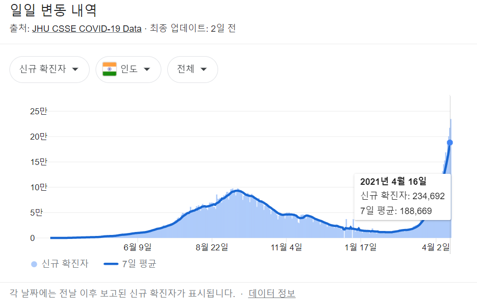 인도에서 일일 신규 확진자로는 사상 최대치인 23만명을 돌파 3일 연속으로 20만명을 기록하여, 추세 역시 사상 최대 누적 확진자 수로도 미국에 이어 세계 2위 https://www.news1.kr/articles/?4278053 0