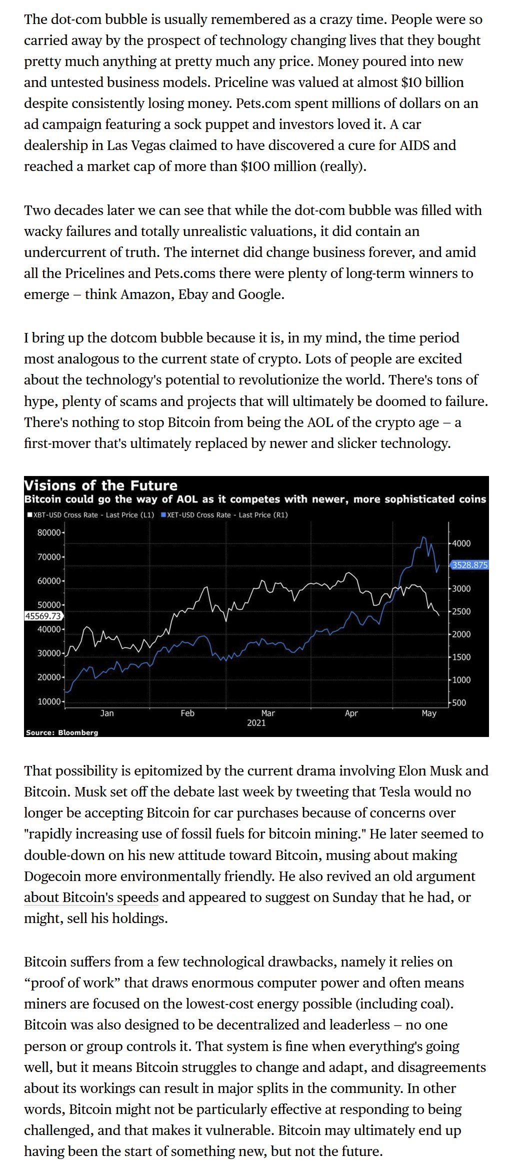 ▷비트코인 열풍은 그리 오래 지속되지 않을 것이다. 비트코인은 비효율적이고 낭비적이며 조악하게 설계된 코인이다. 비트코인의 목적도 부적절하다. 비트코인이 미술 시장처럼 지속될 수도 있다. 비트코인에 큰돈을 투자한 일부 부유층이 허구적 가치를 높일 수 있기 때문이다. 그러나 더 나은 기술이 그 자리를 대체하게 될 것이다.
