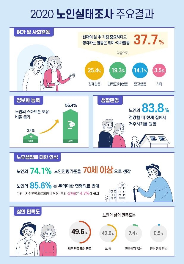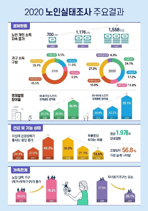 출처: https://news.naver.com/main/read.nhn?mode=LPOD&mid=sec&oid=001&aid=0012442104 2020 노인실태조사입니다. 긍정적인 변화가 많은게 그나마 다행이네요. 옛날의 노인과 지금의 노인은 다른데, 이 차이점을 최대한 이용해야 급격한 고령화의 충격이 완화가 될 겁니다. 0