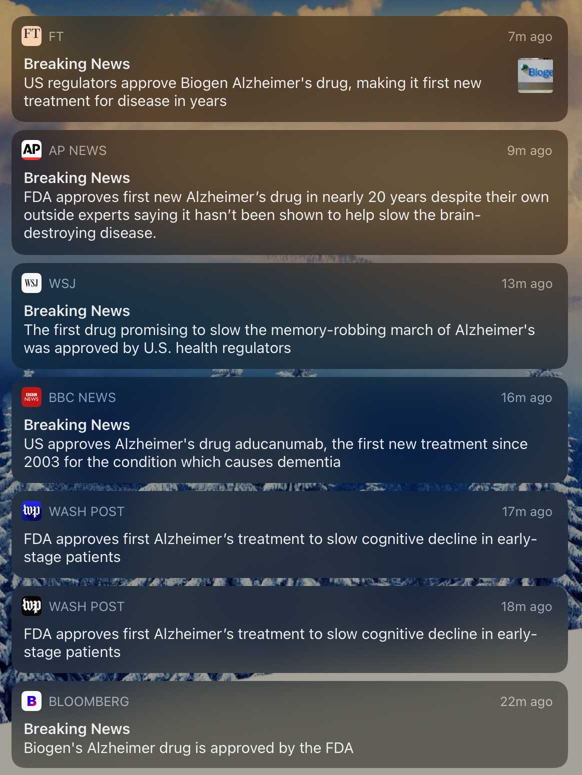 https://m.yna.co.kr/view/AKR20210608003000071 회복보다는 지연에 가까운 것 같고, 비용도 1년에 56,000불 가까이 들 것이라는 얘기도 있습니다. 신약승인에 안 좋은 선례가 될 것이라는 지적도 있습니다. 알츠하이머 자체에 대한 연구도 더 필요하겠지만, 일단 환자나 환자 가족들한테는 좋은 소식일지도 모르겠습니다. 다른 뉴스지만, 이것도 흥미롭더군요. https://www.yna.co.kr/view/AKR20210607137500009 0
