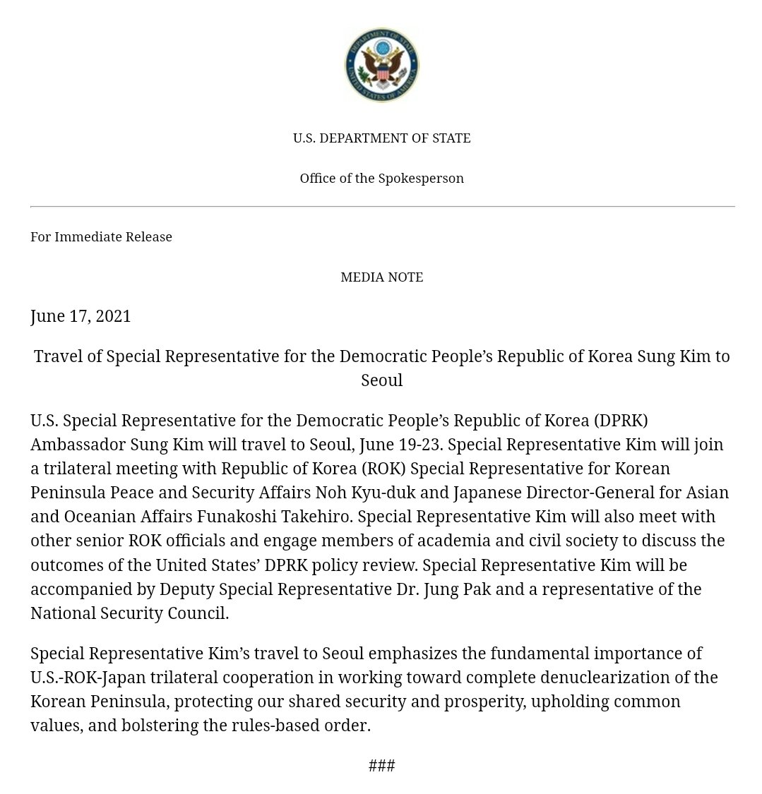 미 국무부에서는 내일부터 23일까지 일정으로 성 김 신임 대북특별대표의 방한을 밝혔습니다.