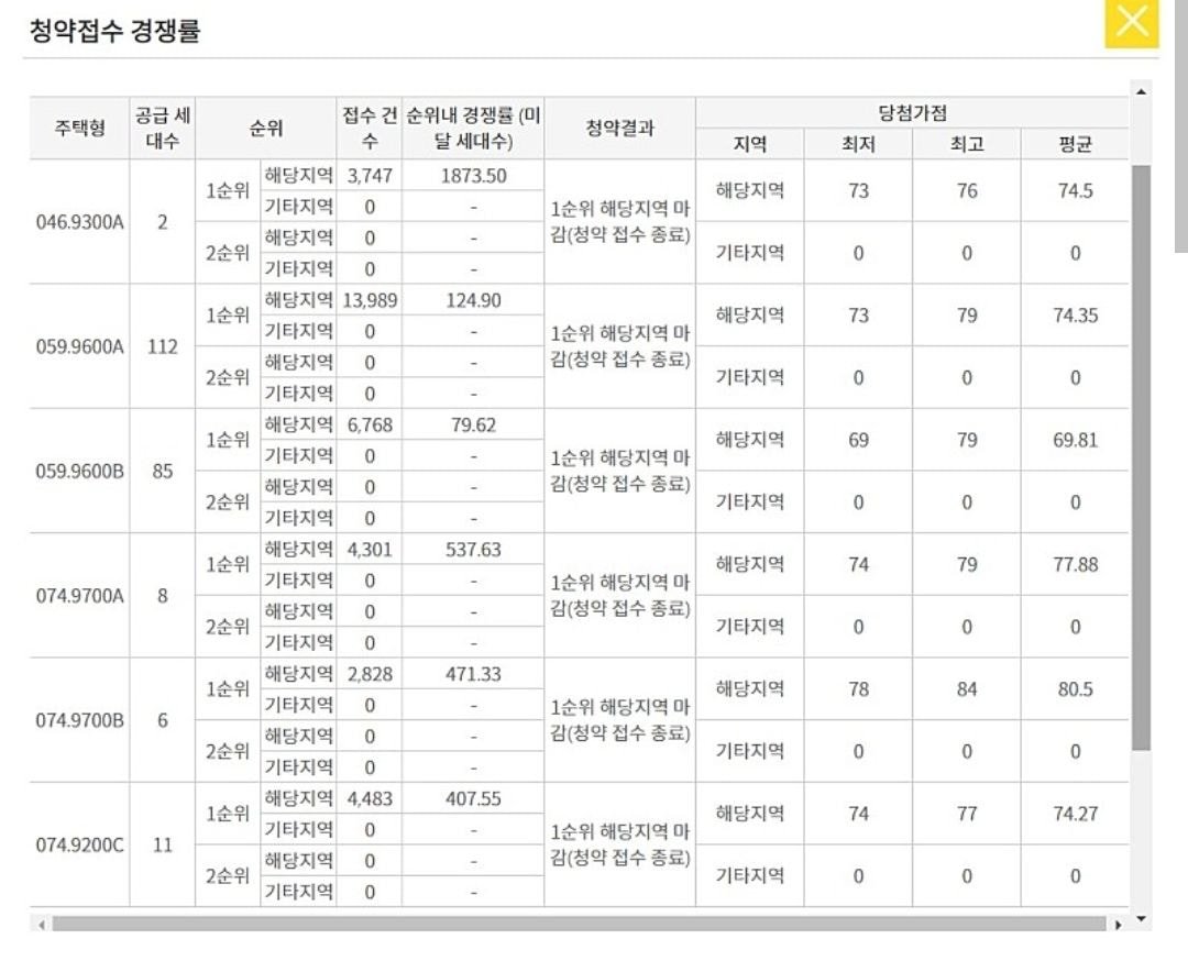 나머지 5개 주택형은 커트라인이 73점 이상을 기록했다. 평균 커트라인을 보면 △46㎡A형 74.5점 △59㎡A형 74.3점 △59㎡B 69.8점△74㎡A 77.8점 △74㎡B 80.5점 △74㎡C 74.2점 등이었다.