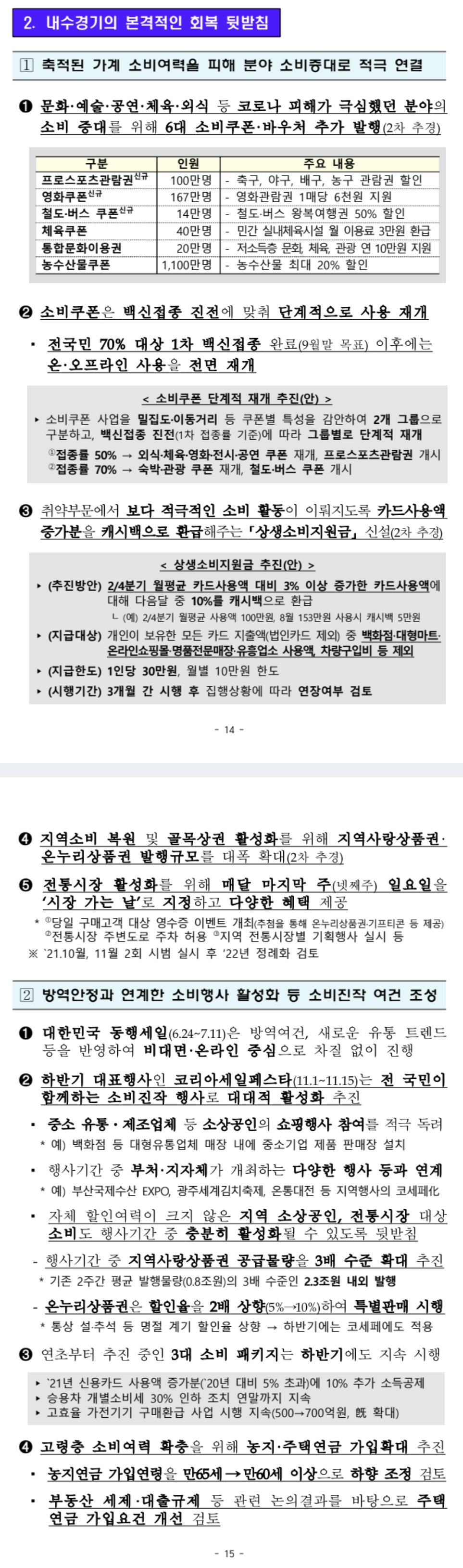 카드 사용액 캐시백은 목표 자체가 저소득층이 아닌 소비 여력이 있는 (상대적) 고소득층의 추가 소비를 유도한다는 것이기는 하고, 영화, 스포츠 관람 등 할인 쿠폰이라든지, 철도, 버스 할인 쿠폰이라든지, 피해 업종에 집중해서 지원하기 위한 방식이라지만, 제한된 사람들만 쓸 수 있는 품목, 방식도 그렇고, 그냥 예산을 합쳐서 지난번 전국민 지원금처럼 상대적으로 간단한 방식으로 일괄적으로 지급하는 쪽이 낫지 않을까 싶은 생각도 듭니다. 피해업종 집중 지원, 소비촉진이라는 목표가 있고, 예산이 부족해서 이런 방식을 쓰는 것 같기도 합니다만.