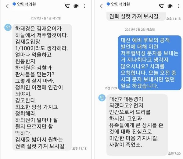 | Subject | "故김재윤이 저주할 것"…안민석, 심야 시각 하태경에 협박 문자 |