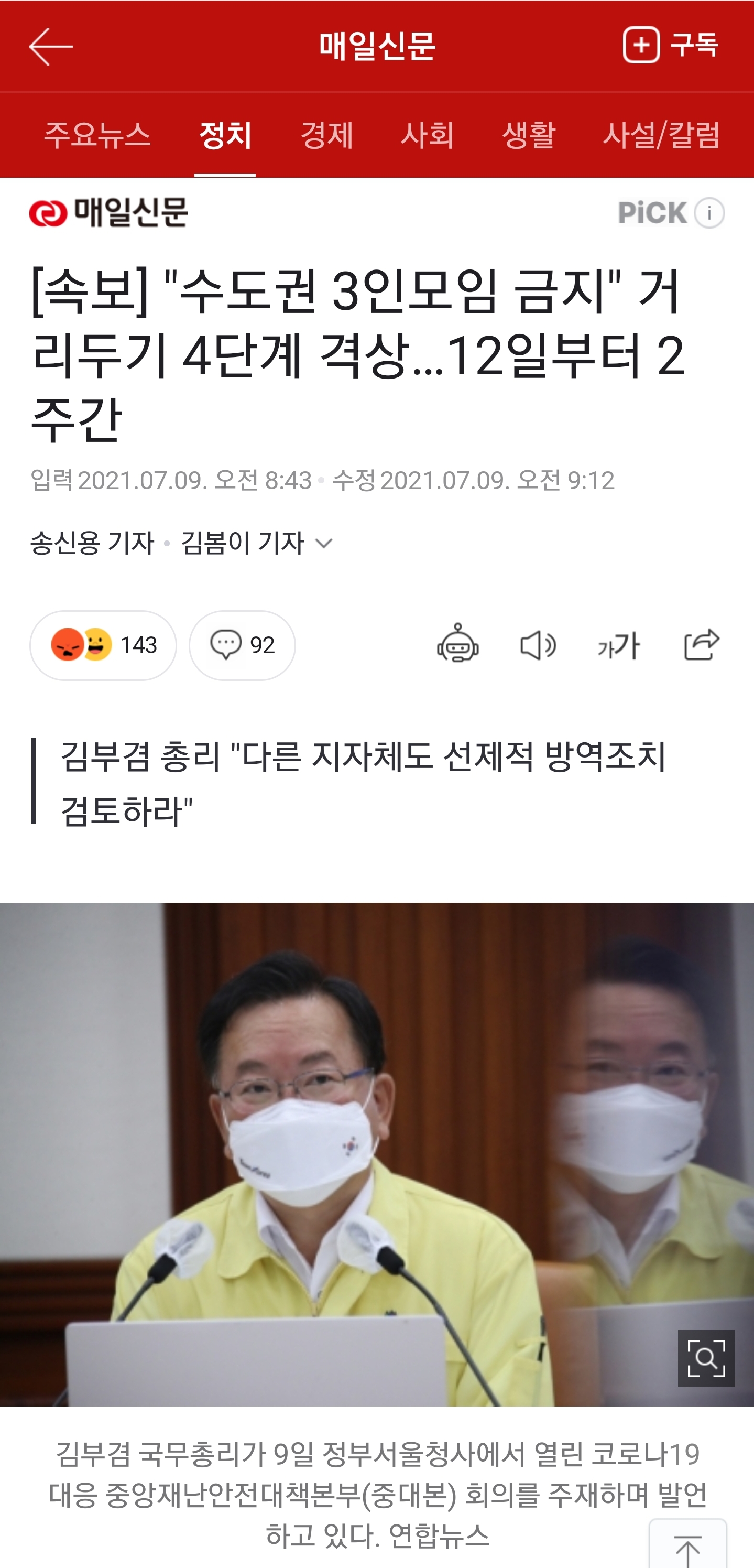 Subject   "수도권 3인모임 금지" 거리두기 4단계 격상…12일부터 2주간