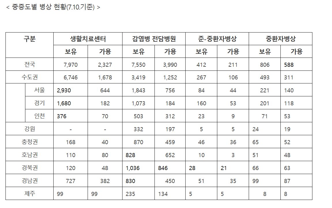 참고로 당국에서 밝힌 7월 10일 기준 병상 현황인데, 수도권의 경우 1,678상 가능하다고 나오지만, 하루면 거의 다 찰 수 있는 숫자라.