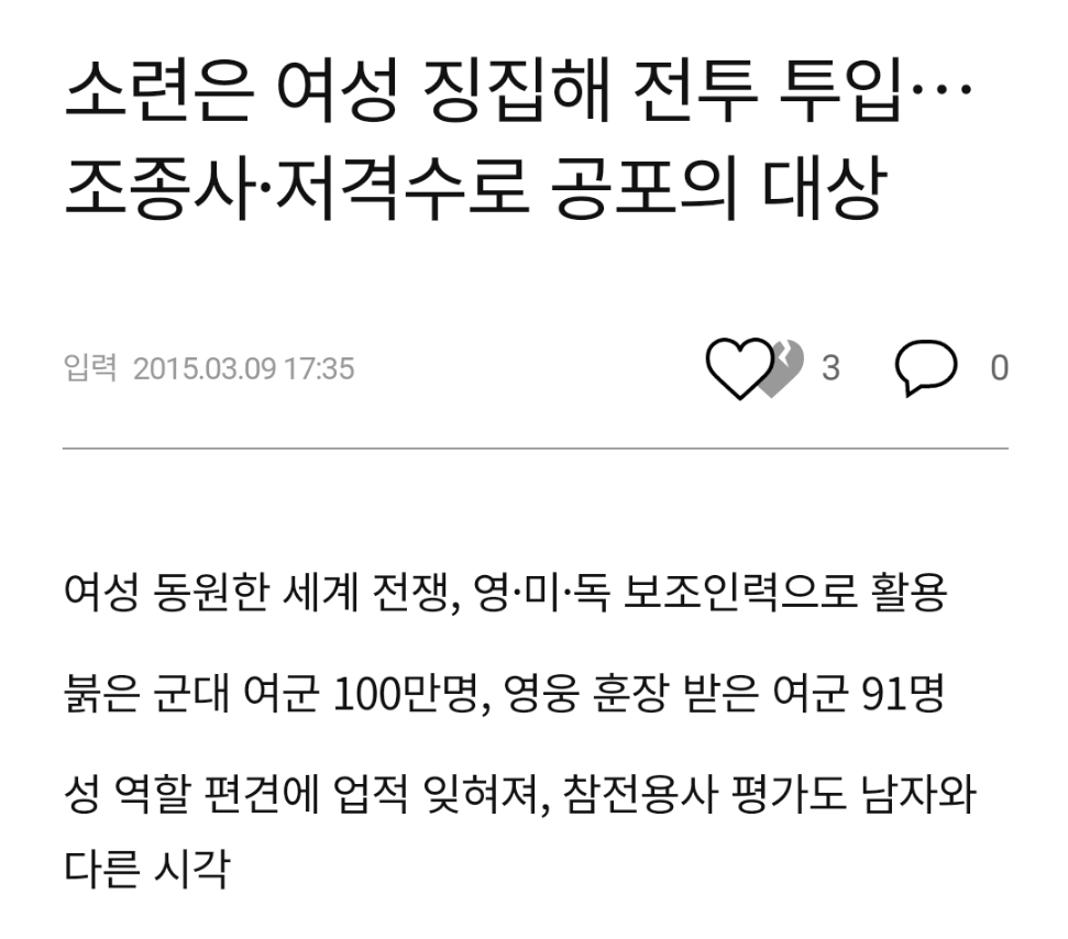 여군이 국방에서 제역할 잘해준 케이스는 드물거나 제한적이거든요. 간호장교나 일부 저격병정도? 여군이 그만큼 군사적 가치가 낮은데 굳이 형평성 맞추겠다고 각종 사회적 비용 늘려가며 징집하느니 군 장병 대우 개선과 제대로 된 군필자 보상안 마련이 훨씬 합리적이라고 봅니다. 인구절벽도 오히려 군 구조조정과 기계화로 대응하는게 더 효율적인 방법이겠죠.