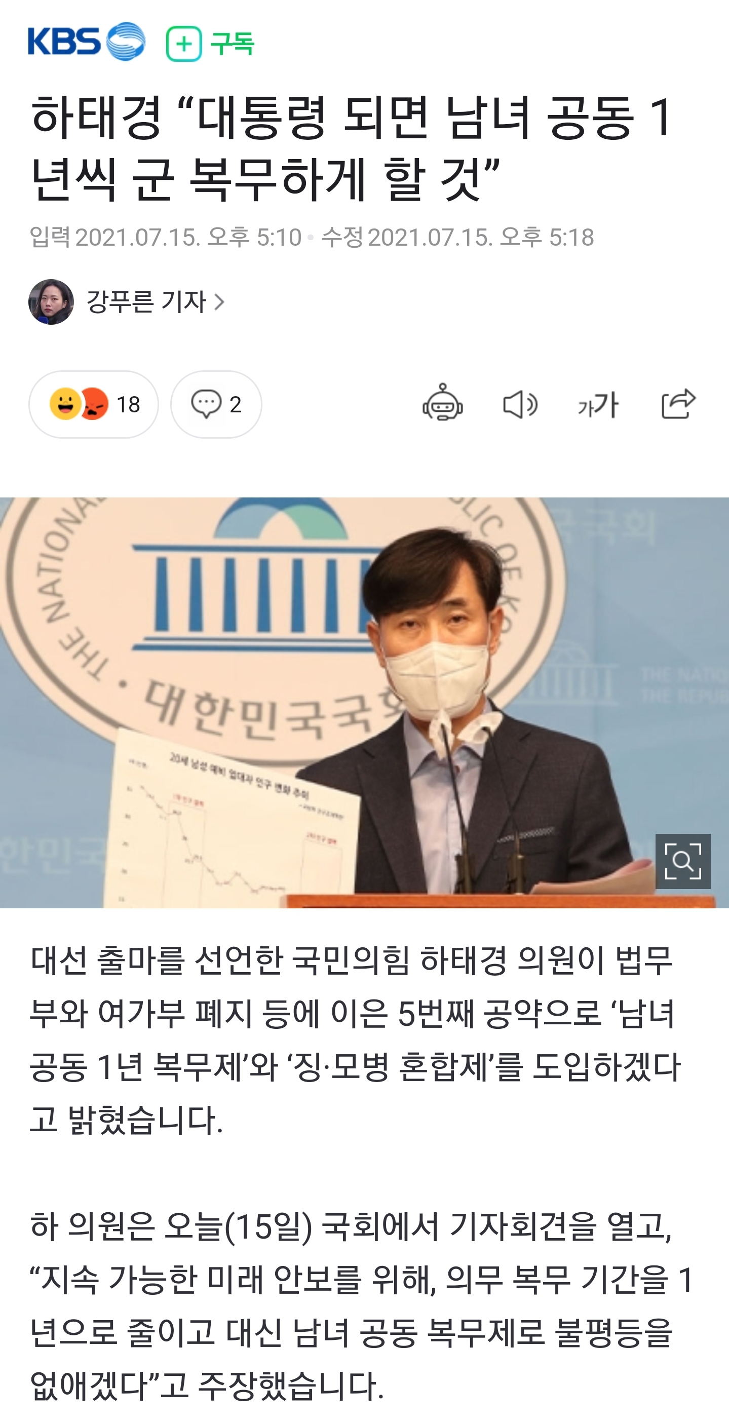 | Subject | 하태경 “대통령 되면 남녀 공동 1년씩 군 복무하게 할 것” |