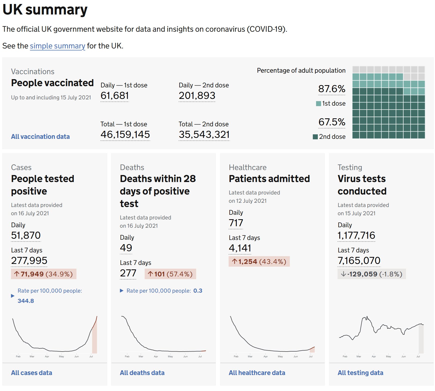 https://www.yna.co.kr/view/AKR20210717031300009 https://www.yna.co.kr/view/AKR20210717026000009 https://coronavirus.data.gov.uk/ *입원 데이터와 검사 수 데이터는 시차가 좀 더 있습니다. 며칠 사이 축구 여파인지 확진자와 입원환자 모두 많이 늘어났다는 소식들이 들립니다. https://www.yna.co.kr/view/AKR20210717004951091 용감한 실험에는 항상 영국이 앞장서는 전통이(?) 있었읍니다?! 가 아니고, 코로나19가 세계에 확산하던 초기에도 영국은 스웨덴 비슷한 길을 갈 뻔한 적이 있는데, 영국 과학계 내부의 자정(?) 작용으로 스웨덴처럼 되지는 않았습니다. 이후 백신에 적극 투자하고, 접종을 열심히 해서 정치적으로도 큰 성공을 거두었는데, 또 다른 시험대 앞에 선 것 같습니다. 최근 소위 코로나19와 함께 살아가기 전략을 내비친 곳 중에는 싱가포르도 있었는데, 영국과 직접 비교하기는 여러 면에서 부적절하겠습니다만, 완화 조치 하루만인 어제 다시 방역조치, 사회적 거리 두기 등을 강화한다고 발표했습니다. 장기적으로는 매일같이 확진자 수를 공개하고, 확진자 동선을 하나하나 추적하고 하는 것을 그만두고 일상에서 코로나19와 함께 살아가는 쪽으로 가게 될 것 같지만, 백신 접종률이라든지 다른 여건이 아직 그럴 수 있을 때인지는 잘 모르겠습니다. 영국도 변이에 축구 경기 여파까지 더해서 확진자 수 외에 입원 환자 수도 늘고 있다고 합니다. 일단, 아직은 영국 정부는 예정대로 규제를 완화할 것이라고 합니다. 미국은 신규확진자수가 오늘 3개월만에 최대치인 79,310명을 기록했습니다. (어제보다 3배 폭증;플로리다 데이터가 일주일에 한 번 일 단위가 아닌 주 단위로만 보고되는데 그것이 컸습니다. 그러니까 엄밀히는 미국 전역 하루만이 아닌 플로리다의 한 주 데이터가 포함된 하루인(?) 것입니다.) 미국은 화이자 백신의 정식 승인이 나오면 접종률이 올라갈 것을 기대하고 있어서, 내년 1월이 아닌 앞으로 2개월 이내에 승인이 나올 수도 있다는 보도들이 있었습니다. https://youtu.be/eebxoygjvTQ 영상은 어제 것입니다. https://youtu.be/WmNj9E8rhNo 오늘 영상 추가했습니다. 지난 기사 https://www.yna.co.kr/view/AKR20210709114100076 https://www.yna.co.kr/view/AKR20210712002700072 싱가포르의 방역 조치 강화 발표 https://www.moh.gov.sg/news-highlights/details/updates-on-phase-3-(heightened-alert)-measures Mass infection is not an option: we must do more to protect our young https://www.johnsnowmemo.com/ https://www.thelancet.com/journals/lancet/article/PIIS0140-6736(21)01589-0/ 2