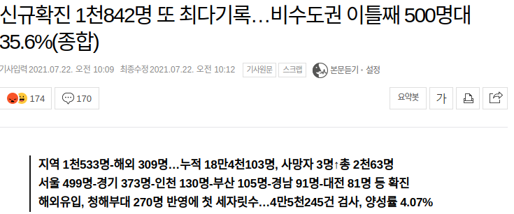 25040 의료/건강신규확진 1천842명 또 최다기록…비수도권 이틀째 500명대 35.6%(종합) 7 바닷가소금짠내 21/07/22 4160 0