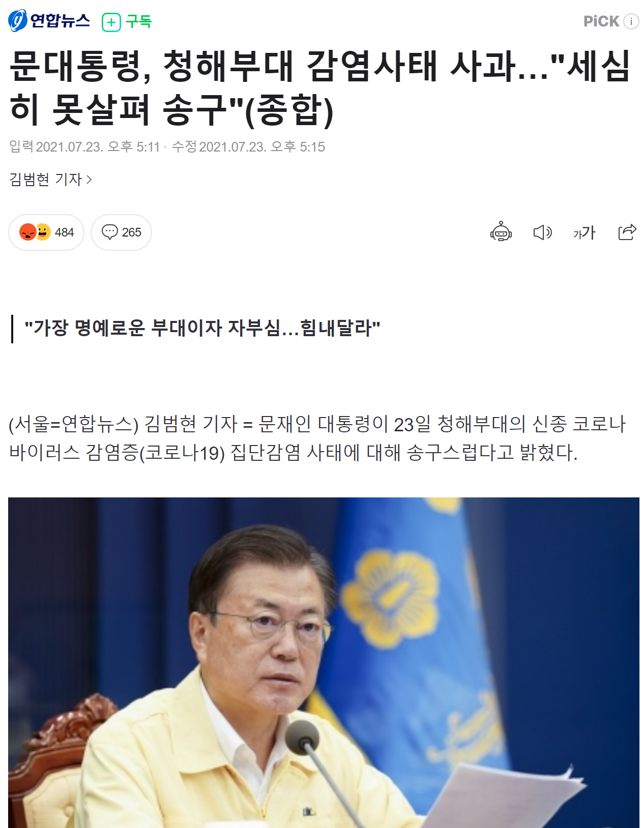 | Subject | 문대통령, 청해부대 감염사태 사과…"세심히 못살펴 송구" |