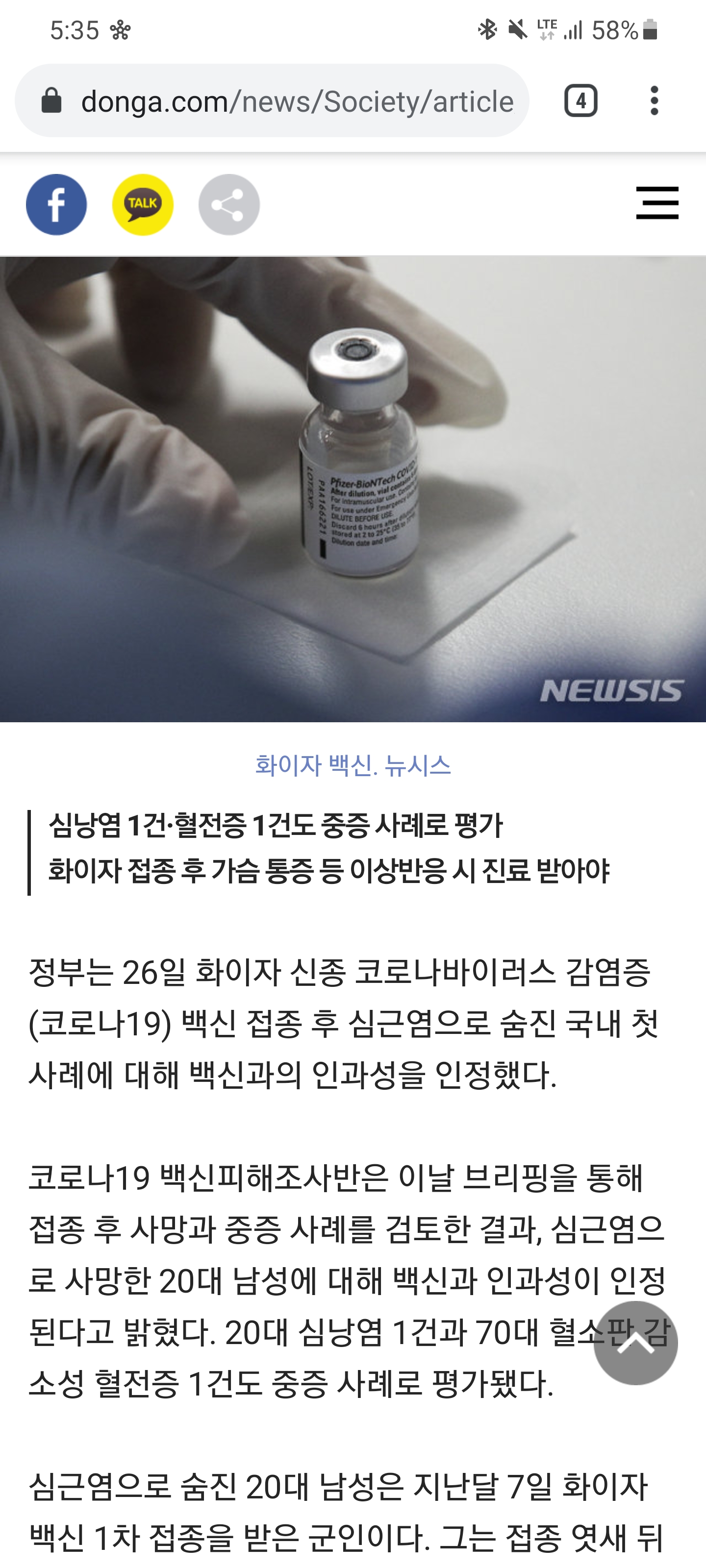 https://www.donga.com/news/Society/article/all/20210726/108167553/1 화이자 백신 접종 후 심근염으로 사망한 20대 군인이 최초로 화이자 백신의 부작용인 심근염으로 사망한 사례로 인정받게 되었습니다. 백신 접종을 멈출 순 없지만 한편으론 이런 부작용이 나타나는 걸 막을 수 없다는게 슬프네요. 0