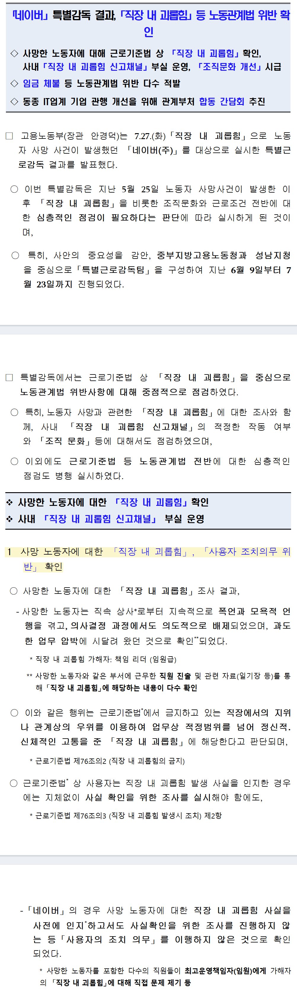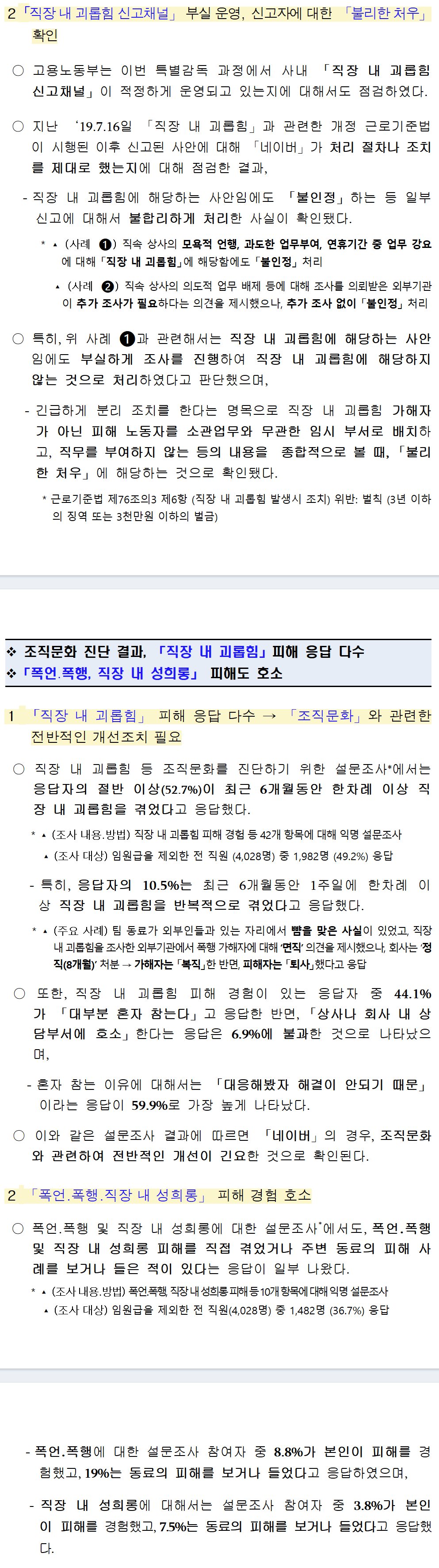 네이버 측에서는 고용노동부의 발표 이후에도 조사 내용의 상당 부분을 부인하고 있습니다. 특히, 경영진이 직장 내 괴롭힘을 사전에 인지하고 있었다는 것과 신고자에 대해 불리한 처우를 했다는 점을 차후에 소명하겠다며 구체적인 설명 없이 부인하고 있습니다. 임금 체불 부분은 해당 업종(?)의 '선택적 근로시간제' 특성이 있어서 변명의 여지가 있는지도 모르겠습니다만.
