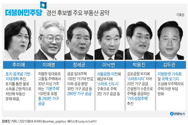 https://www.yna.co.kr/view/AKR20210804077351001?section=politics/all 추: 토지공개념! 불로소득 차단! 명: 기본주택 100만! 총 250만! 균: 난 280만! 낙: 서울공항이전! 진: 김포공항이전! 원가 공급! 관: 지방분권 가속화! 뭔가 이상한게 하나 껴있는 것 같긴하네요.. 다들 묻고 따블로 가는 분위기. 현: 아파트는 빵이 아닙니다. MB: 선거 땐 뭔말을 못해. 0