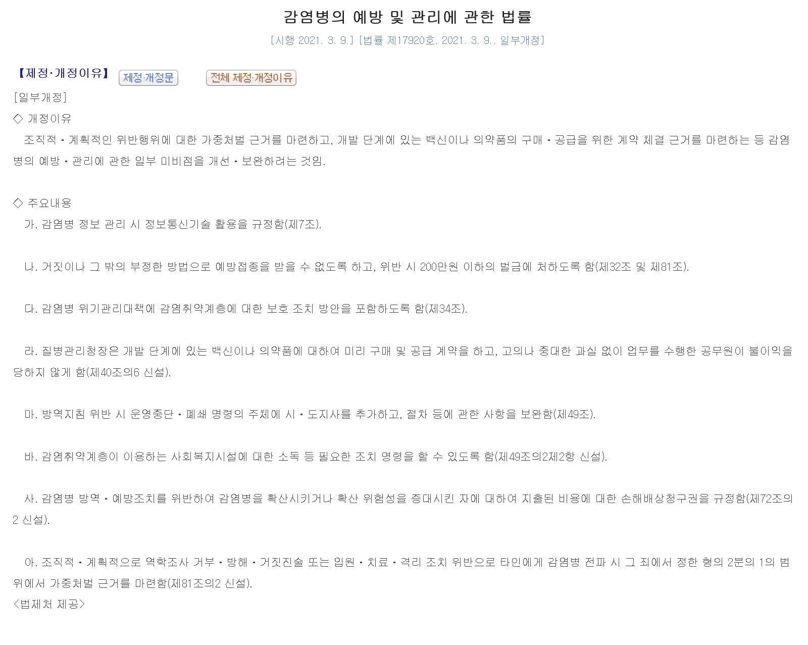 감염병의 예방 및 관리에 관한 법률도 코로나19 때문에 짧은 기간에 여러 차례 바뀌었군요.