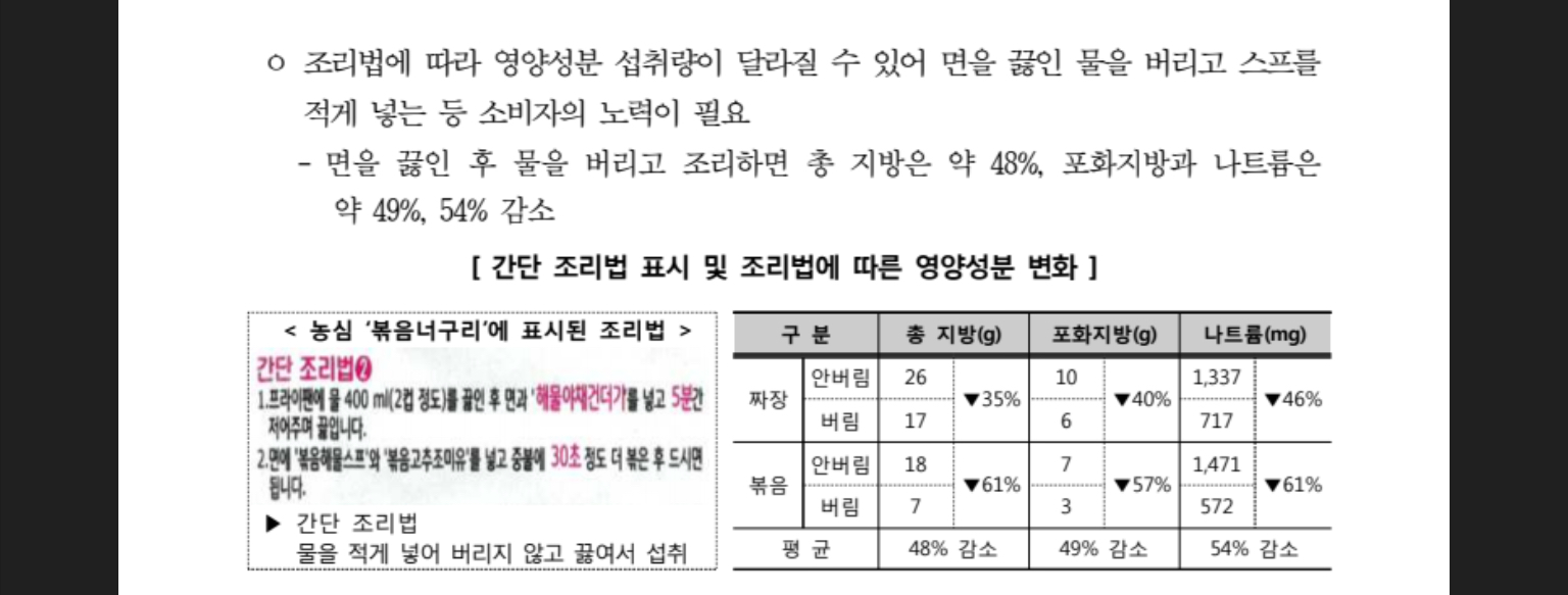 https://n.news.naver.com/article/023/0003633375?cds=news_my 건강 생각할거면 라면을 먹지 말아야… 근데 저런 라면은 원래 조리할때 물을 버리지 않나요? 피할 수 없다면 건강하게라도 먹어보자. 조리법에 약간의 변화를 줘도 건강한 라면을 먹을 수 있다. 한국소비자원에 따르면 면을 끓인 후 물을 버리고 조리하면 지방은 약 48%, 포화지방은 약 49%, 나트륨은 약 54%씩 감소한다. 면을 끓일 때는 물을 충분히 넣는 게 좋다. 이 부분이 무슨 소리인지 모르겠네… 0