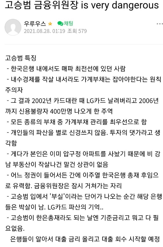 신임 금융위원장(이후 한국은행장으로 갈 가능성이 높다고 알려진)이 강경한 매파로 알려져 있는데요. 연일 가계부채에 대해 강경대응을 시사하고 있습니다.