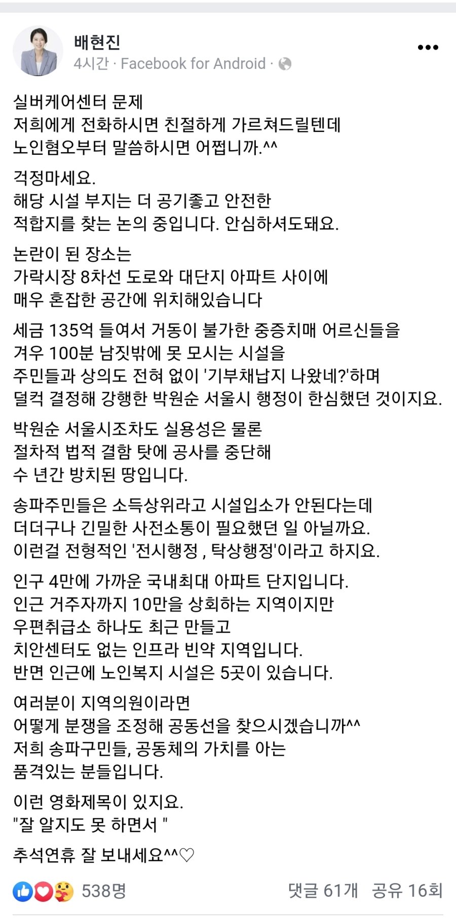 Subject   배현진, 실버케어센터 무산에 “기뻐”… 진중권 “징그러운 인간들”