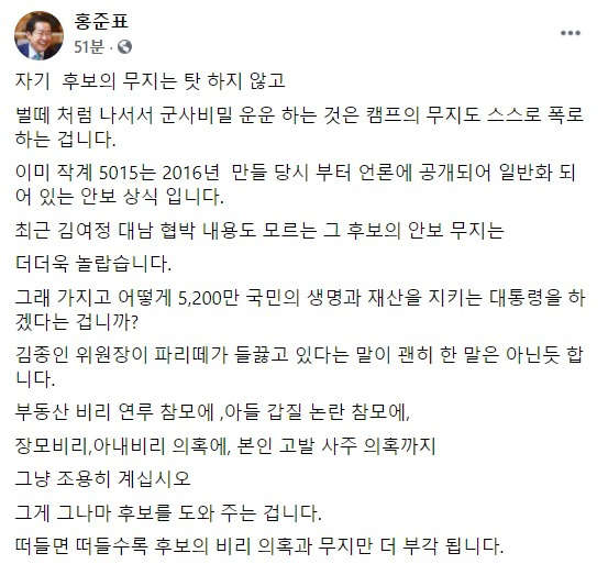 홍준표 후보는 즉각 반발했다. 그는 "작계 5015는 이미 언론에도 공개된 유사시 한미 대북 작전계획"이라며 "국회 국방위원회에서도 공개적 토론이 수차례 있었다. 대통령이 될 사람이라면 기본적으로 알고 있어야 할 안보 상식"이라고 말했다.