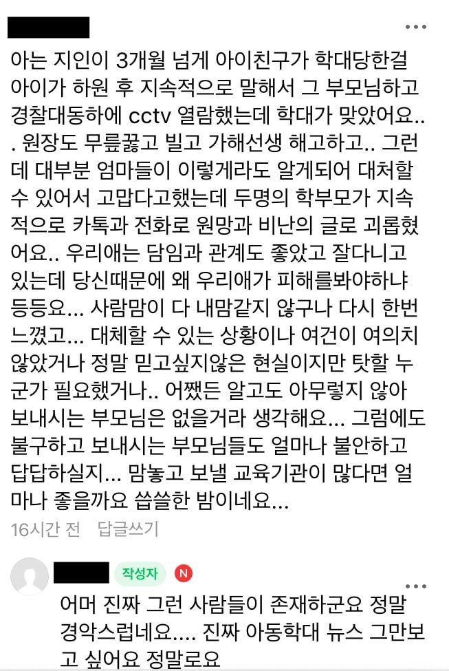 https://imnews.imbc.com/replay/2021/nwdesk/article/6305736_34936.html 영훈이 자리만 혼자 짝꿍 없이 외딴 섬처럼 홀로 떨어뜨려 놓는가 하면, 숙제 검사 때 2분 동안 투명인간처럼 세워둡니다. 친구들이 노는 동안에도 영훈이만 책상에 손을 올려놓고 20분 넘게 사실상 벌을 섭니다. "(가해 교사가) '책상 위에 세균이 많은데… 아이가 (책상을) 문질러서, 가서 지적을 하고 온 거다.'" 영훈이 엄마는 가해교사와 함께, 학대를 방조한 혐의로 원장까지 경찰에 고소했고, 경찰은 저장된 9일치 CCTV에서 170건이 넘는 학대행위를 확인했습니다. 가해 교사는 점심을 많이 주고 다 먹게 강요하는가 하면, 친구들이 남긴 죽까지 먹게 했다고 합니다. 원장은 취재를 거부했고, 사건 이후 해고당한 가해 교사 측은 "할 말이 없다"는 입장입니다. 서강대학교가 운영하는 유치원 본사는 수사를 지켜보겠다고만 밝혔습니다. 도대체 왜.. 후기까지 끔찍하네요. 0