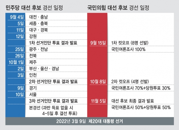 https://m.yna.co.kr/view/GYH20210825001100044 (화이트리스트 이슈로 그래픽은 다른곳에서 가져옴) 반면 국민의힘은 9월 15일 국민여론조사 100%로 1차 컷오프를 통해 8명을 선발할 예정이다. 이후 국민 여론조사 70%와 당원투표 30%를 반영해 2차 컷오프 후 4명을 선발한다. 최종 후보는 국민 여론조사 50%와 당원투표 50%를 통해 11월 5일에 발표된다. 비슷한일이 또 있을까 순전히 제가 궁금해서 한번 찾아봤습니다. 0
