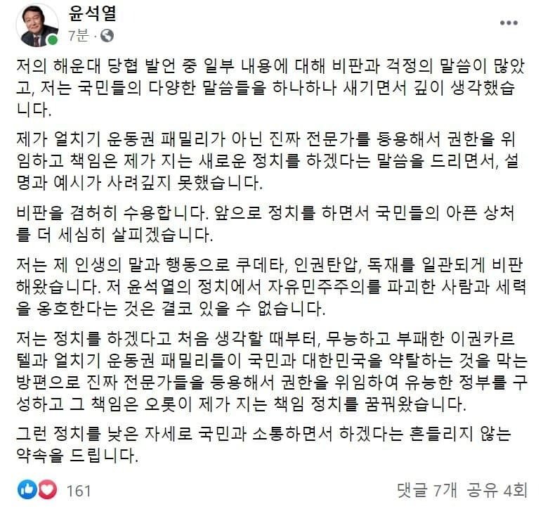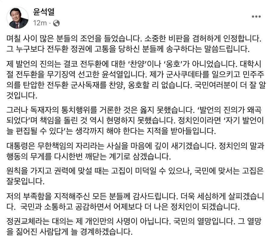 Subject   윤석열, '전두환 발언'에 "부적절 비판 겸허히 수용…유감"