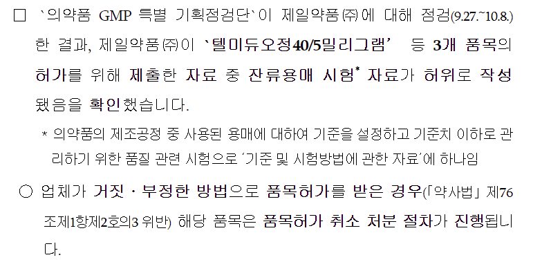 이건은 비보존때 이후로 생긴 내부고발로 인한 식약처 특별감사에서 최초 품목허가를 신청할 때 제출하였던 세 개 배치의 품질관리 기록 중 잔류용매가 기준치를 넘어 일탈되었음에도 불구하고 품질관리 서류를 조작하여 품목허가를 받았다가 고발되어 걸린 건입니다.