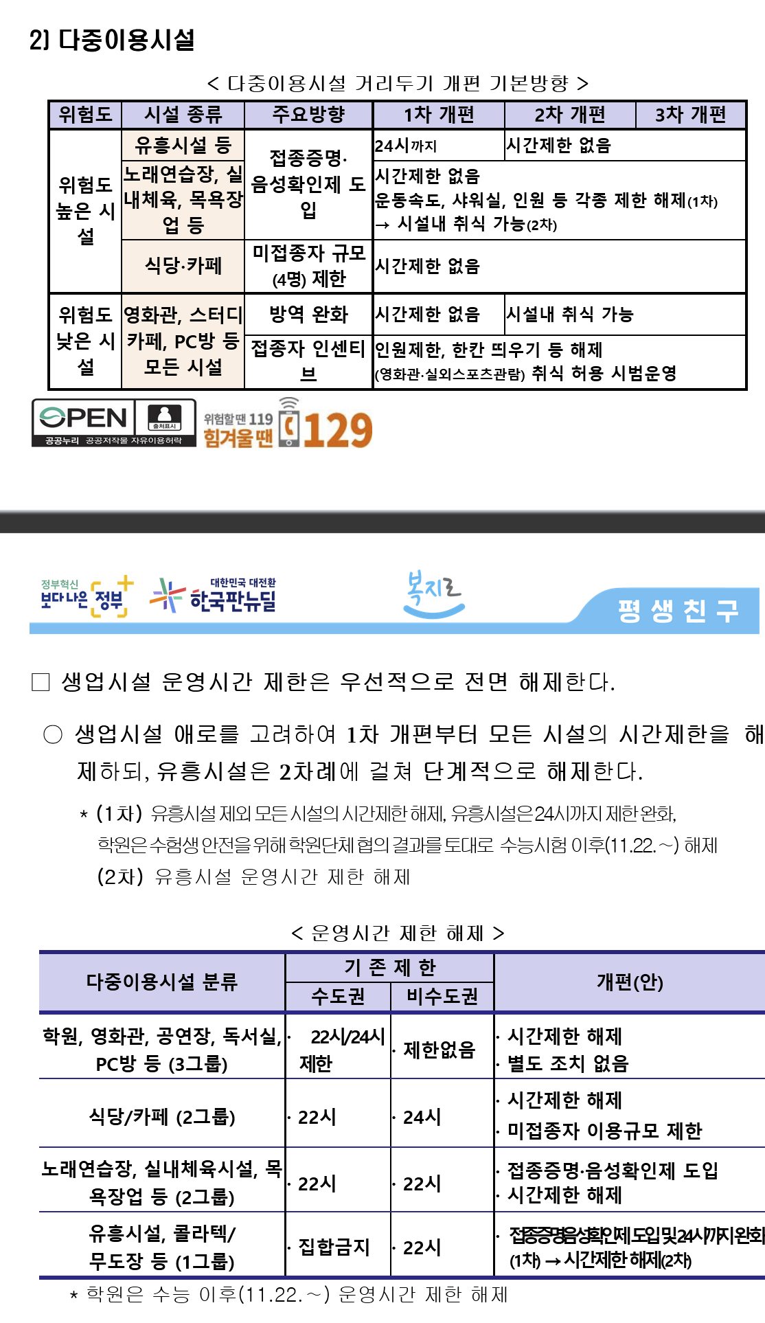 https://www.yna.co.kr/view/AKR20211029033154001 https://www.mohw.go.kr/react/al/sal0301vw.jsp?PAR_MENU_ID=04&MENU_ID=0403&page=1&CONT_SEQ=368300&SEARCHKEY=TITLE 경각심이 가능한 유지 되어서, 비상계획 발동 안 되고 의료자원이 부담할 수 있는 선에서 유지가 되어서 천천히(?) 기 감염자가 늘고, 최대한 사망자가 적기를 바랍니다. 고위험군과 그 동거 가족들은 더 조심을 해야 할지도 모르겠습니다. 31일 핼러윈데이 때문에 1단계 시작은 1일 오전5시부터라고 합니다. 2