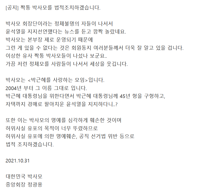 https://news.v.daum.net/v/20211031160550490 박근혜 전 대통령 지지모임인 ‘박사모(박근혜 대통령을 진정으로 사랑하는 사람들 모임)’ 회장단이 국민의힘 대선주자인 윤석열 전 검찰총장에 대한 공개적인 지지를 보냈다. 앞서 다른 박 전 대통령 지지모임이 당내 경쟁자인 홍준표 의원을 지지하자 세력 싸움을 하는 모양새다. 당내 경쟁자인 홍준표 의원과 유승민 전 의원을 향해서는 비판의 목소리를 높이며 사퇴를 촉구했다. 이들은 홍 의원을 향해 “홍준표 후보는 불법 탄핵을 당해 억울하게 옥살이를 하고 있는 박 대통령을 강제 출당시켜 두 번의 상처를 줬다. 탄핵 세력보다 더 나쁜 사람”이라고 지적했다. 이어 유 전 의원을 향해선 “유승민 후보는 박 대통령의 불법 탄핵의 주범이라 국민의힘 후보자격이 없다”고 주장했다. '尹지지' 박사모 짝퉁 논란..윤석열-홍준표 신경전 https://news.v.daum.net/v/20211031205321539 그러나 정작 정광영 박사모 중앙회장은 별도 입장문을 내고 “윤 전 총장을 지지선언한 짝퉁 박사모에 대해 법적 조치에 들어가기로 했다”며 “2004년에 창립된 박사모는 하나뿐”이라고 밝혔다. 박 회장은 “박사모의 명칭을 도용, 윤 전 총장을 지지선언한 것은 박근혜 대통령과 박사모를 모독하는 것으로 이를 묵과할 수 없다”며 “어떻게 박사모가 박근혜 대통령님께 45년을 구형하고 사저까지 공매 처분한 윤석열을 지지할 수 있겠냐”고 목소리를 높였다. 박사모 "홍준표 지지한다..윤석열 용서 못해, 위장침투한 것"_21.10.16 https://news.v.daum.net/v/20211015204057306 호박가족 임산·박사모 정광용 "짝퉁 박사모, 윤석열 지지선언 경악…법적조치" https://www.yeongnam.com/web/view.php?key=20211031010003893 박 전 대통령 지지 모임 단체가 최근 홍준표(대구 수성구을) 의원 지지 의사를 밝힌 가운데, 이날 일부 박 전 대통령 단체가 다른 목소리를 내자 "짝퉁 단체의 지지"라며 홍 의원 지지를 재차 강조한 것이다. '박사모'의 정광용 대표와 공식 팬클럽 '호박가족' 임산 전국 대표는 이날 보도자료를 통해 "2004년 설립된 박사모를 사칭한 짝퉁 박사모가 오늘 윤 후보를 지지 선언한 것을 경악하지 않을 수 없다. 추후 법적 조치가 따를 것"이라며 이같이 밝혔다. 정 대표의 박사모는 2004년 설립돼 현재까지 이어져 오고 있으며 호박가족은 박 전 대통령의 국회의원 시절부터 공식 팬클럽으로 이름을 알렸던 단체다. 앞서 박사모1이 윤석열은 박근혜에게 45년 구형을 내린 사람으로서 홍준표를 지지한다는 의사를 밝힌 적이 있습니다. 그런데 이번에 박사모2가 윤석열의 행동은 공무원으로서 어쩔 수 없는 측면이 있다며 오히려 박근혜를 출당시킨 홍준표, 박근혜 탄핵의 주역인 유승민이 더 나쁘다고 윤석열을 지지한다는 선언을 했습니다. 박사모1은 이에 자신이 2004년 설립된 '정통 박사모'라고 주장하며 법적 조치를 하겠다고 경고했습니다. 박근혜 지지 세력이 윤석열 지지 여부를 두고 갈라선 모양입니다. *박사모1 = 박근혜를 사랑하는 모임 https://cafe.daum.net/parkgunhye *박사모2 = 박근혜 대통령을 진정으로 사랑하는 사람들 모임 (구글링 해봤지만 홈페이지를 못 찾겠습니다) 0