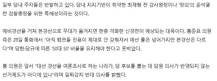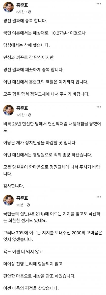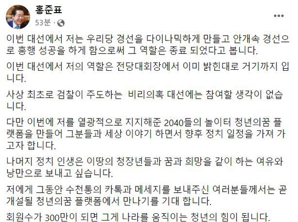 https://news.v.daum.net/v/20211107094653450 대선 경선에서 패배해 윤석열 전 검찰총장에 국민의힘 후보 자리를 내준 홍준표 의원이 7일 "사상 최초로 검찰이 주도하는 비리의혹 대선에는 참여할 생각이 없다"라고 밝혔다. 경선 결과에 승복은 하지만 윤석열 선대위에 함께하지 않겠다는 뜻을 분명히 한 것이다. 홍준표가 윤석열 지원을 적극적으로 하지 않겠다는 의견을 표명했습니다. 또 청년들을 위한 플랫폼 활동을 하겠다고 합니다. 0