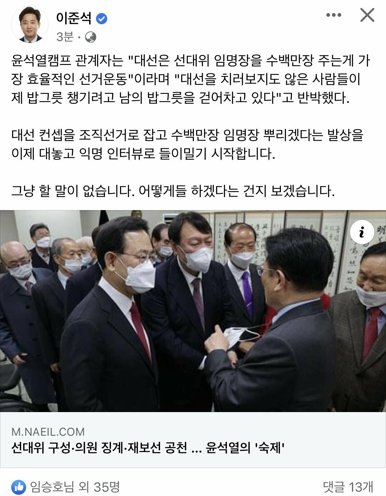 | Subject | 이준석 "尹 선대위 임명장 수백만장 발상? 할 말이 없다" |