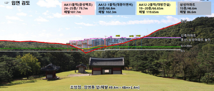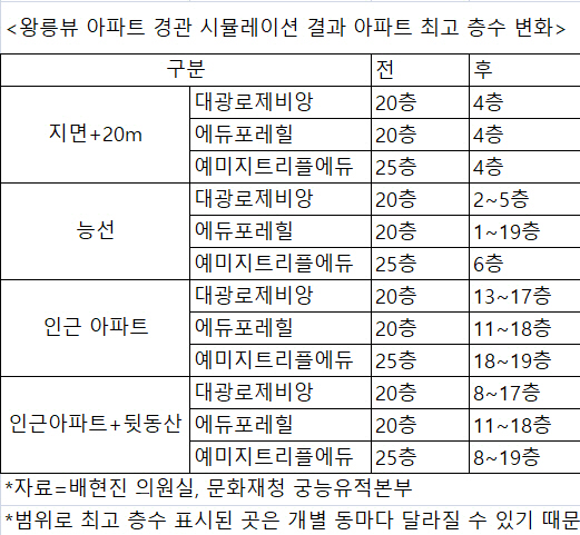 https://www.mk.co.kr/news/realestate/view/2021/11/1065233/ 문화재청 경관 분석 결과 단독 입수 높이 맞추려면 일부 철거 불가피 나무 심어 가리려면 30~58m 필요 문제된 아파트 철거한다 해도 역사보존지역 밖 아파트 보여 `일부 철거` 실효성 논란일 듯 건설사 법적대응시 입주지연 불가피 예비 입주자들도 `단체 행동` 예고 문화재청 궁능유적본부가 '왕릉뷰' 아파트 주변 경관을 분석한 결과 높이 기준을 맞추려면 아파트를 최대 19개층까지 철거해야 하는 것으로 나타났다. 다만 이 경우에도 역사문화환경보존지역(왕릉 500m 반경) 밖에 있는 아파트가 보일 수 밖에 없는 상황이다. 일각에서 제기된 나무를 심어 아파트를 가리는 방안도 검토됐는데 분석 결과 최대 58m에 달하는 수목이 필요한 것으로 조사됐다. 건설사들은 통나무 자르듯 몇개 층을 덜어낼 수 없어 '일부 철거'는 불가능하다는 입장을 보이고 있다. 기술적으로 가능하더라도 잔존 건물의 안정성을 담보할수 없다는 이유에서다. 높이 기준을 맞춰 '일부 철거'라는 결정이 나오더라도 '완전 철거' 이후 재시공이 불가피하다는 것이다. 문화재청은 이번 결과를 바탕으로 소위원회에서 추가 검토를 진행해 최종안을 도출한다는 계획이다. 10일 국회 배현진 의원에 따르면 문화재위원회는 문화재청에 '왕릉뷰 아파트' 경관 관련 시뮬레이션을 요청했다. 지난 28일 문화재위원회가 '김포 장릉' 주변 아파트 건설사들이 낸 개선안을 심의한 후 '보류' 결정을 내린 이후다. 대방건설 에듀포레힐, 금성백조 예미지트리플에듀, 대광로제비앙아파트 등 3곳은 유네스코 세계문화유산인 김포 장릉 주변에 위치하면서도 문화재 심의를 건너뛰고 건설됐다는 논란을 빚고 있다. 문화재청 궁능유적본부가 수행한 시뮬레이션은 지난 8일 결과가 나왔다. 지난달 건설사들의 개선안을 보류한 문화재위원회는 단지별 시뮬레이션 등 보다 기술적이고 전문적인 검토가 필요하다는 이유를 밝혔는데, 이후 나온 첫 시뮬레이션 결과다. 해당 시뮬레이션에서는 에듀포레힐 8개동과 예미지트리플에듀 3개동, 대광로제비앙 아파트 9개동에 대해 검토가 이뤄졌다. 왕릉뷰 아파트 경관 시뮬레이션 결과 아파트 최고 층수 변화 사진설명왕릉뷰 아파트 경관 시뮬레이션 결과 아파트 최고 층수 변화 이번 시뮬레이션에서 문화재청 궁능유적본부는 높이 20m와 김포 장릉이 위치한 산의 능선, 인근 아파트 높이 등을 기준으로 아파트 최고 높이과 최고 층수를 분석했다. 문화재 심의 기준인 최고 높이 20m 기준에 맞추려면 3개 아파트에서 문제가 되는 동을 모두 4층으로 만들어야 한다는 결론이 나왔다. 김포 장릉이 있는 산의 능선을 기준으로는 대광건영은 기존 20층을 2~5층으로, 대방건설은 기존 20층을 1~19층으로, 금성백조는 기존 25층을 6층으로 만들어야 한다는 분석이다. 주변 인근 아파트(장릉삼성쉐르빌)를 기준으로 높이를 낮추더라도 대광은 13~17층, 대방은 11~18층, 금성백조는 18~19층으로 높이를 낮춰야한다. 문화재청 궁능유적본부가 무허가 건축 논란을 빚고 있는 `왕릉뷰` 아파트에 대한 시뮬레이션을 실시했다. [자료 = 문화재청] 사진설명문화재청 궁능유적본부가 무허가 건축 논란을 빚고 있는 `왕릉뷰` 아파트에 대한 시뮬레이션을 실시했다. [자료 = 문화재청] 문화재청의 능·원·묘 경관검토기준에서는 능의 전면 시야 범위를 확보하고, 능이 마주보는 산(안산·案山)으로 조망성을 확보해야 한다고만 규정하고 있다. 시뮬레이션에서 고려된 높이 20m와 능선, 인근 아파트 높이 등 어떤 기준으로 문화재청이 판단할지는 불명확하다는 얘기다. 하지만 어느 기준을 적용하더라도 기존 층수를 낮춰야해 '일부 철거가 불가피하다'는 이야기가 문화재청 안팎에서 거론된다. 다만 시뮬레이션 결과 문제가 되는 아파트 동을 철거 하더라도 역사문화환경보존지역 범위(500m) 밖 아파트가 김포 장릉에서 보일 수 밖에 없는 것으로 분석 돼 '철거의 실효성' 문제는 남는다. 건설사들은 일부 철거에도 부정적인 상황이다. 건물 골조가 이미 다 올라와 있는 상태에서 톱질하듯이 건물의 일부만 잘라낼 수 없기 때문이다. A건설사 관계자는 “일부라도 철거 결정이 나면 기술적으로 철거가 가능은 하더라도 잔존건물의 안정성을 담보할 수 없다"며 "안전과 소음 문제로 문제가 없는 아파트 동도 사실상 정상 입주가 어려워 질 것"이라고 설명했다. 건설사들이 철거 명령에 대해 행정소송 등으로 대응할 경우 입주가 상당기간 지연될 가능성도 거론된다. 이번 시뮬레이션에서는 수목을 심어 아파트를 가리는 대안도 나왔다. 홍살문(능 앞에 세우는 붉은색을 칠한 나무문) 근처에 수목을 심을 경우 최소 30m이상, 능선과 아파트 바로 앞 동산에 수목을 심을 경우 각각 33m와 58m의 나무가 필요한 것으로 분석됐다. 나무를 심어 가리는 안은 이병훈 더불어민주당 국회의원이 지난달 21일 제안한 안이기도 하다. 배현진 의원은 "건설사와 지자체의 방조와 문화재청의 직무유기 사이에서 가장 피해를 보고 있는 것은 결국 아파트 입주 예정자들"이라면서 "입주민 피해를 최소화하기 위해서라도 문화재청에서 언제까지 결론을 내릴지 