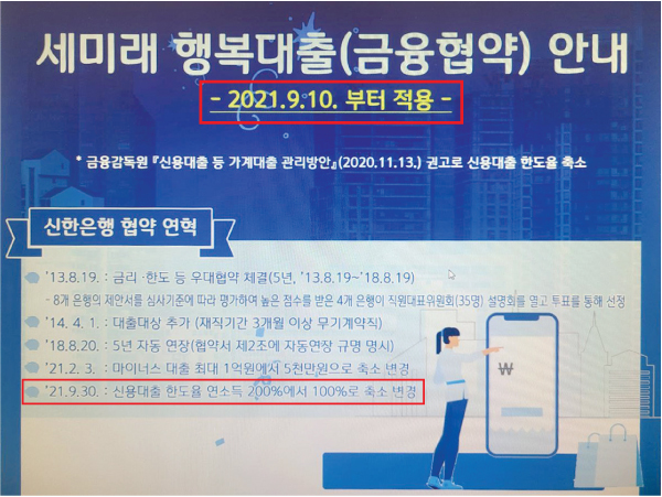 http://news.kmib.co.kr/article/view.asp?arcid=0924218551&code=11151300&cp=nv 신한은행이 지난 9월 국세청 직원 전용 신용대출 한도를 축소하는 과정에서 국세청에 이 정보를 사전 유출한 것으로 확인됐다(국민일보 11월 16일자 1면 보도). 신한은행과 저금리 대출 협약을 맺은 일부 기관 소속 직원들이 대출 규제 시행 직전에 이를 알고 대거 ‘대출 쇼핑’에 나서 이 은행의 평균금리를 기형적으로 끌어내렸다는 의혹이 사실로 드러난 셈이다. 서민들은 영문도 모른 채 고금리 ‘대출 절벽’에 몰리는 사이 ‘힘 있는’ 공무원들만 특혜를 누렸다는 비판이 일고 있다. 16일 더불어민주당 김두관 의원실에 따르면 신한은행은 지난 8월 말 국세청에 ‘세미래 행복대출(금융협약) 안내문’을 발송했다. 신한은행은 “9월 10일부터 신용대출 한도율이 연 소득의 200%에서 100%로 축소 변경된다”고 사전에 고지했다. 대출 규제 10일 전에 미리 알려준 것이다. 세미래 행복대출은 신한은행이 판매 중인 국세청 직원 전용 대출 상품이다. 최대 2억원까지 빌려주며, 평균금리는 연 1.80%(지난 8월 기준)에 불과하다. 신한은행이 사전에 정보를 유출하면서 이를 인지한 국세청 직원들이 대거 특혜성 대출을 받으면서 신한은행의 9월 마이너스통장 평균금리는 연 2.86%로 다른 시중은행에 비해 최대 1% 포인트가 낮아지는 통계 왜곡현상마저 일어났다. [일반 금융 소비자들은 영문도 모른 채 대출 한도가 깎여 애를 먹은 데 비해 국세청 직원들은 대출 제한도 늦게 적용되고 그 사실마저 사전에 안내받는 특혜를 누린 것이다.] 김 의원은 “2018년 7월 국세청이 신한은행에 대한 세무조사를 개시했고, 그다음 달에 국세청과 신한은행의 대출협약이 5년 연장되면서 금리가 더 낮아지는 등 특혜가 강화됐다”고 말했다. 이에 대해 신한은행 측은 “대출 조건이 기존 협약 내용과 달라졌기에 내용을 통보한 것”이라고 해명했다. [국세청은 당초 9월30일까지 특혜성 대출을 받을 수 있다고 공지했다가 국정감사를 하루 앞둔 10월 7일 김 의원실에서 문제를 제기하자 뒤늦게 7일에서야 내부게시판의 공지를 30일에서 10일로 수정했다.] 이번에 문제가 된 것은 신한은행의 국세청 협약 상품이지만, 공무원·공공기관 직원을 대상으로 한 특혜성 저금리 대출은 다른 시중은행 사이에서도 관행처럼 이뤄지고 있다. 김 의원실이 입수한 ‘공무원 대출상품 현황’에 따르면 지난 4월 기준 5대 시중은행(KB국민·우리·하나·NH농협·신한은행)이 공무원연금관리공단, 경찰청, 국세청 등 기관과 협약을 맺고 판매 중인 대출 상품은 28종에 달한다. 금리도 연 1.25%(KB무궁화 신용대출), 연 1.69%(NH 공무원생활안정자금) 등 웬만한 최고 신용등급자에게 적용되는 금리보다 낮은 수준이다. 이 같은 공무원 대상 ‘특혜 대출’ 비용은 고스란히 일반 금융소비자에게 전가된다. 또 대출 총량이 엄격히 규제되는 상황에서 대출이 꼭 필요한 서민들에게 직접적인 피해가 돌아간다는 지적이다. 김소영 서울대 경제학과 교수는 “시중은행이 자율적으로 공무원 대출상품을 팔았다면 문제가 없겠지만, 특정 집단의 영향으로 저금리 상품이 판매됐다면 문제”라며 “이 경우 상품 판매 과정에서 발생한 비용이 일반 금융소비자에게 전가되는 등 형평성 문제가 발생할 수 있는 만큼 금융 당국이 면밀히 모니터링해야 할 것”이라고 밝혔다. ------------------------------------------------------------------------ <신한·우리銀도 신용대출 한도 '연봉 이내' 축소> https://news.mt.co.kr/mtview.php?no=2021091509562356855 [신한은행은 지난 10일부터 연소득을 기준으로 산출하는 개인 신용대출 한도를 '연소득의 100%'로 조정했다.] 2018년 기사<신한은행, 국세청 세무조사 받는다…신한캐피탈 이어 줄조사> https://www.sejungilbo.com/news/articleView.html?idxno=13273 대한민국 정책브리핑의 반박내용 <국세청, 세무조사 때마다 특혜? 사실과 다르다> https://www.korea.kr/news/policyNewsView.do?newsId=148894057 금리특혜야 공무원의 직업안정성을 이유로 어느정도 수긍이 가능한 부분이고 2013년 신한은행 세무조사와 국세청 특약금리계약, 2018년 세무조사와 국세청 특약금리 재계약이 우연의 일치로 갱신기간이 겹쳤으며, 신한은행측에서 세무조사를 잘 봐달라며 금리를 더 깎아줬을거라는 증거는 없습니다만 타 뉴스 기사들 참조하면 신한은행은 9월 10일부터 신용대출 최대한도를 100%로 하향시켰습니다. 하지만 국세청 직원대출은 9월30일까지 200%로 대출을 많이 받을수 있도록 한것은 명확한 특혜로 보입니다. 0