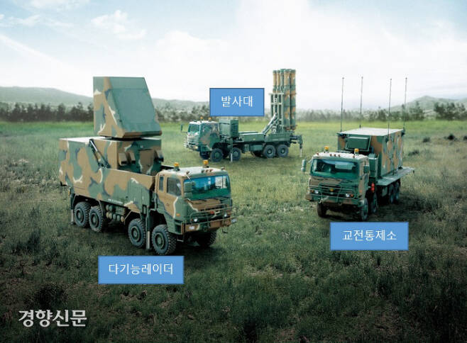 천궁 개념도 그래픽. 천궁 체계는 교전통제소, 다기능레이더, 발사대, 유도탄으로 구성되어 있다. 방위사업청