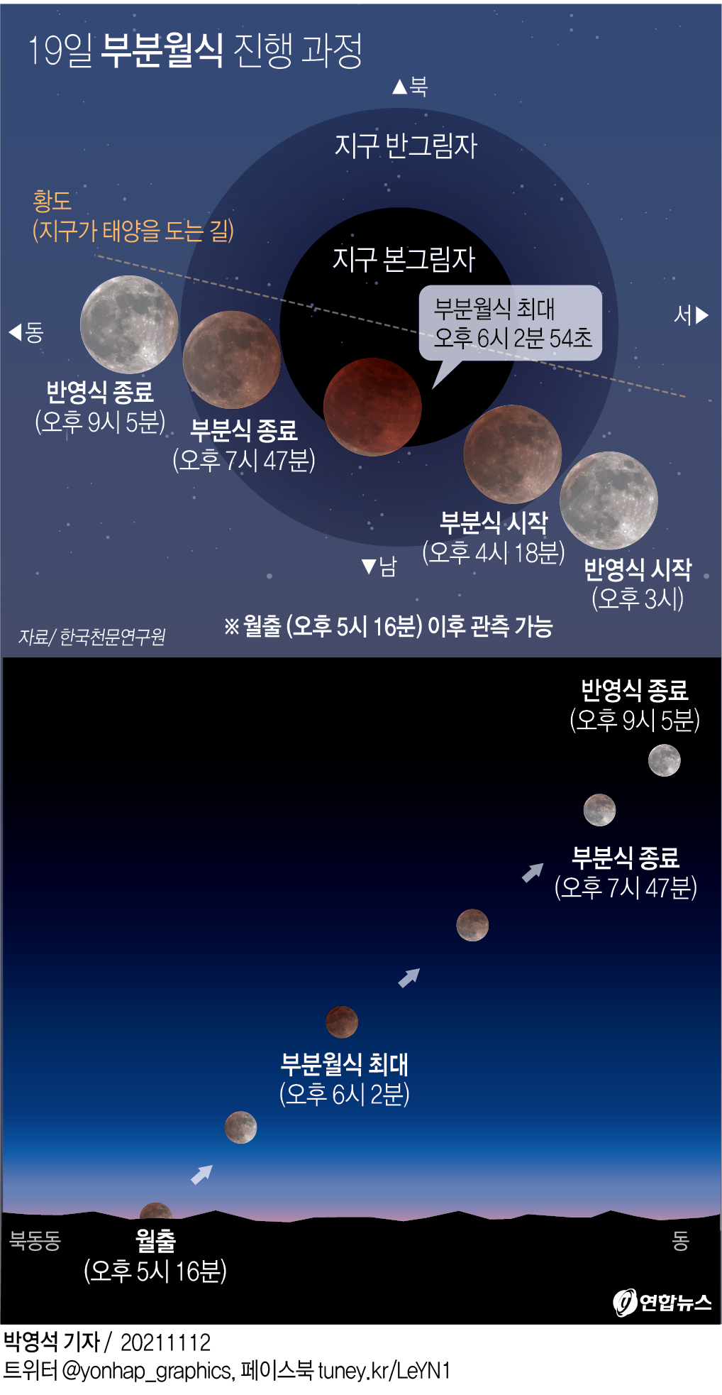 https://www.yna.co.kr/view/AKR20211118109200063 우리나라에서는 월출(17:16) 이후부터 볼 수 있지만, NASA 발표에 따르면 3시간 28분 지속되어 580년 만에 가장 긴 부분월식일 것이라고 합니다. 국립중앙과학관에서는 오후 5시부터 유튜브에서 동해안 지역 영상을 공유할 예정입니다. https://www.youtube.com/c/%EA%B5%AD%EB%A6%BD%EC%A4%91%EC%95%99%EA%B3%BC%ED%95%99%EA%B4%80nsm 1