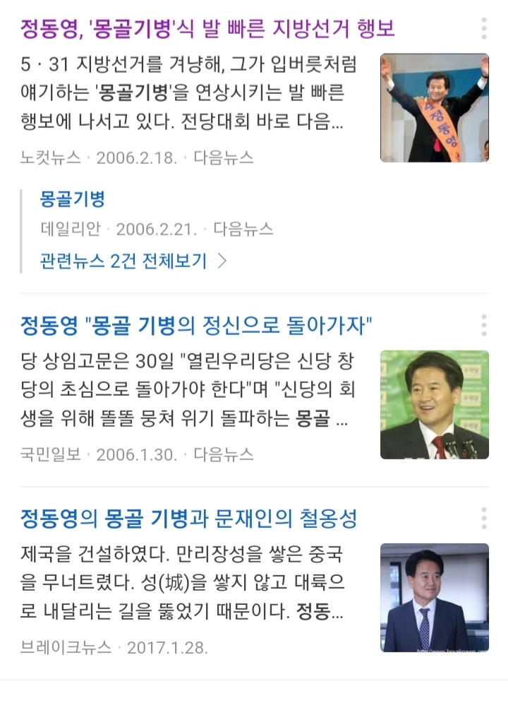 정대철·정동영 복당? 이재명 "과거 일 따지지 말고 힘 합치자는 것" https://news.v.daum.net/v/20211126164730486 이재명 더불어민주당 대선 후보는 26일 ‘정대철, 정동영, 천정배 전 의원 등 구민주계·동교동계에 복당 의사를 타진했느냐’는 질문에 “국가 사범, 파렴치범이라 탈당하거나 제명된 사람들이 아니고 국가의 미래를 걱정하는 민주개혁 진영의 일원이라면 과거에 어떤 일이 있었는지 따지거나 가리지 말고 힘을 합쳐야 한다”고 했다. https://news.v.daum.net/v/20211125060031618 “몽골 기병대였으면 이미 진격해 점령했을 것이다.” (11월 17일 뉴스1 인터뷰) “몽골 군인 10만 명이 유럽과 아시아를 휩쓴 힘은 빠른 속도, 단결된 힘이었다. 빠르게 행동하는 소수가 전체를 석권한다. 민주당의 이재명이 아니라 이재명의 민주당으로 만들어 가겠다” (11월 20일 충남 논산의 한 전통시장 연설에서) 이재명 더불어민주당 대선 후보가 연일 ‘몽골기병론’을 꺼내고 있다. 비대한 여의도 조직과 대비해 이재명식 정치의 ‘속도’와 ‘추진력’을 강조하기 위한 비유다. 13세기 몽골 기병은 기동성과 효율성을 바탕으로 불과 25년 만에 로마군이 400년간 정복한 것보다 더 넓은 땅을 차지했던 것으로 알려져있다. 이 후보는 지난 23일에는 이를 변형해 “우린 김대중 정부의 초고속 인터넷망, 노무현 정부의 전자정부, 문재인 정부의 데이터 댐이라는 소중한 기반을 갖고 있다. 고구려 기병처럼 이 토대 위에서 대한민국의 디지털 영토를 전방위적으로 개척해 무한한 기회를 창출하겠다”는 표현도 내놨다. 이 후보의 경쟁자인 윤석열 국민의힘 대선 후보측에서도 몽골 기병론을 들고 나왔다. 김한길 전 새정치민주연합 대표는 지난 21일 윤 후보 직속 새시대준비위원장을 맡기로 한 뒤 기자들과 만나 “국민의힘도 이제는 중원을 향해 두려움 없이 몽골 기병처럼 진격했으면 좋겠다”고 말했다. 중도 외연 확장을 위한 교두보 역할을 하게 될 새시대준비위원회가 ‘중원’으로도 불리는 중도층 공략의 사명을 갖고 있다는 점을 강조한 것이란 풀이가 나왔다. 열린우리당 정동영 의장의 몽골 기병식 https://news.bbsi.co.kr/news/articleViewAmp.html?idxno=299103 2004-02-07 추미애, “몽골기병보다 로마보병” https://www.fnnews.com/news/200401161039051488 2004-01-16 정동영 "신(新)몽골기병론, 속도감ㆍ역동성 갖고 민생 속으로" https://www.nocutnews.co.kr/news/119963 2006-01-30 "몽골기병·별동대" 언급 이재명…與 선대위 대규모 쇄신? https://www.nocutnews.co.kr/news/5659668 2021-11-19 야당에는 김한길, 여당에는 정동영.. 갑자기 대한민국을 강타하는 몽골 기병론.. 이재명이 '민주당의 모든 계파 통합'을 위해서 정동영 등 복당을 추진하고 있습니다. 다시는 보지 않을 거 같던 이름들이 여기저기 마구 등장하네요. 0