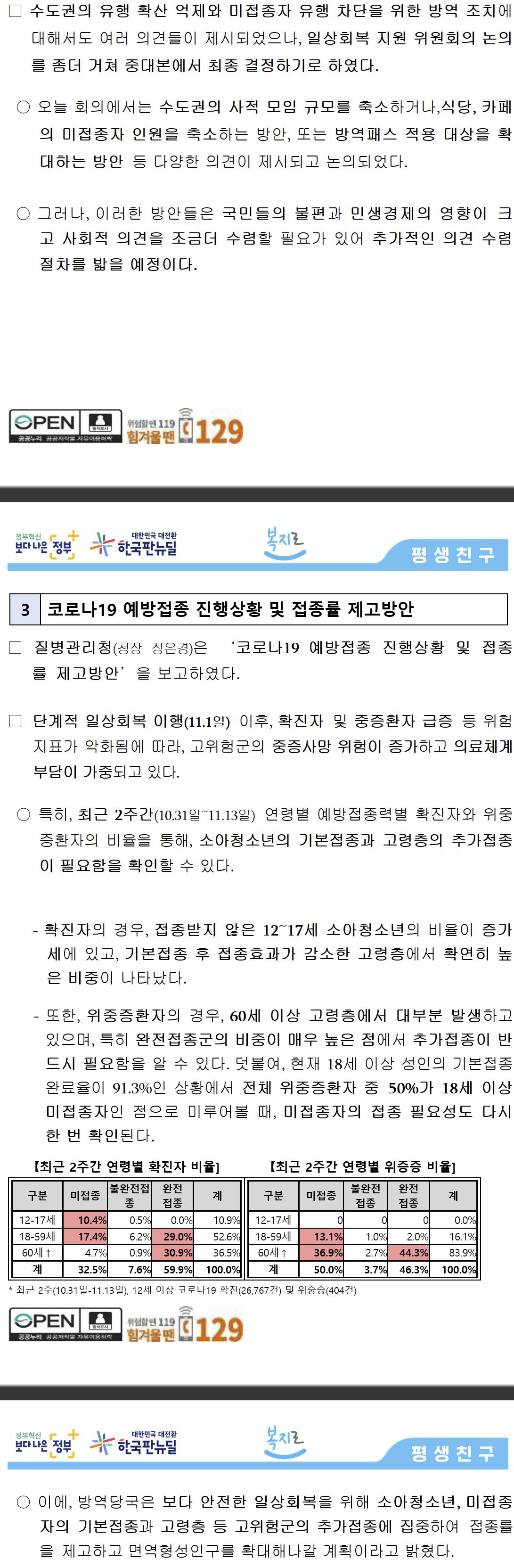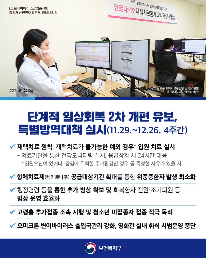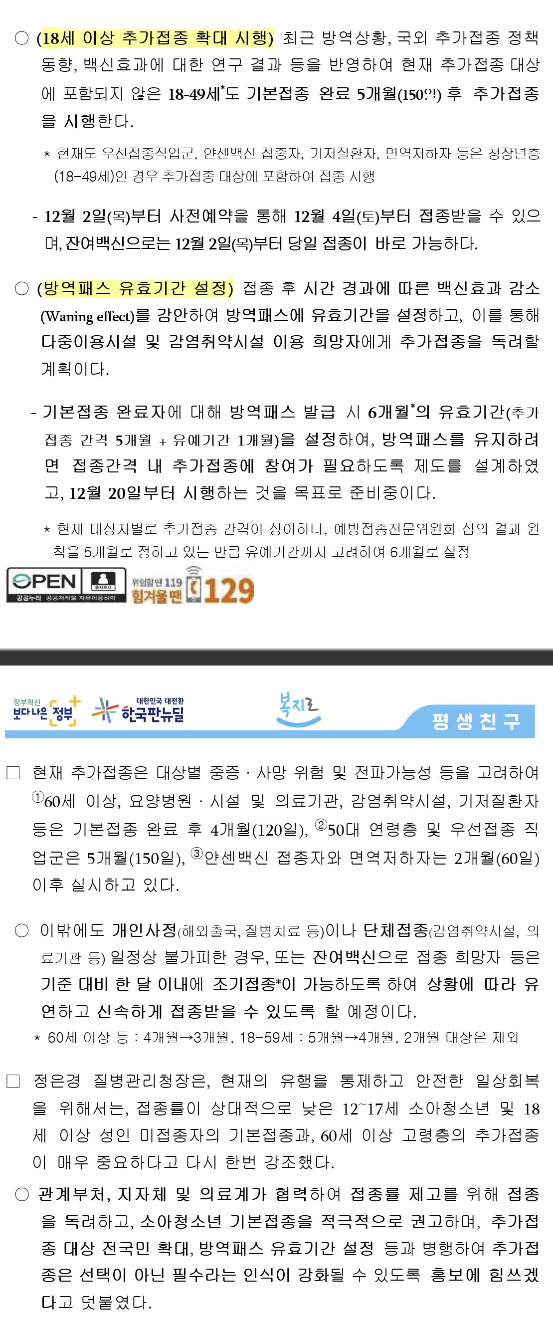 https://www.yna.co.kr/view/AKR20211129149251530 https://www.yna.co.kr/view/AKR20211129145651530 https://www.yna.co.kr/view/AKR20211129162400530 *자세한 내용은 보도자료와 브리핑 영상 참고하세요. 종합기사로 수정했습니다. https://www.mohw.go.kr/react/al/sal0301vw.jsp?PAR_MENU_ID=04&MENU_ID=0403&page=1&CONT_SEQ=368622 https://youtu.be/Fad5PBLwA2g 26일에서 미뤄진 발표와 질답이 끝났습니다. 대통령 발언에서 예고되었듯이 당장 거리두기 강화 발표는 없었고(, 대신 완화;단계적 일상회복 2단계로의 이행;2차 개편도 당분간 없다?), 역시나 상황에 따라 사적 모임 인원 제한(축소) 등은 검토 상태인 것으로 유지. (일상회복단계 시행하면서 상황 악화시 '비상계획' 표현을 썼었는데, 상황이 안 좋아지고, 어감이 안 좋아서인지 당국에서 '비상계획'에 대해서는 용어 정의를 다시 하려는 기색을 비추고, 사용은 저어하고 있는 상황입니다.) 영화관 내 집단감염 사례 때문에 앞으로 접종완료자 및 PCR음성자 전용관 내 취식 허용은 잠정 중단한다고 합니다. 그리고, 지금도 수도권부터 충청권까지 중환자 병상 여유가 없는 상태라 동의를 구한다고는 하지만, 일단은 재택치료인 경우가 많습니다만, 앞으로는 70세 미만 무증상, 경증환자에 본인과 보호자가 동의한 사람 한정이 아니라 모든 확진자 치료의 기본이 재택치료라고 합니다. 재택치료 확대와 더불어 국산 항체치료제인 렉키노나주;레그단비맙의 처방/투여가 재택치료자까지 대상으로 확대될 것이라고 합니다. (단기외래진료센터 등 이용) 한편, 18~49세는 기본접종 완료 5개월(150일) 후 추가접종을 한다고 합니다. 12월 2일(목)부터 사전예약, 12월 4일부터 접종. 잔여백신 접종은 12월 2일부터. (잔여백신 접종은 기준(5개월)보다 한 달까지 당겨서 접종할 수 있습니다.) 방역패스는 기본 5개월 + 유예기간 1개월로 앞으로 6개월로 유효기간이 설정됩니다. 0