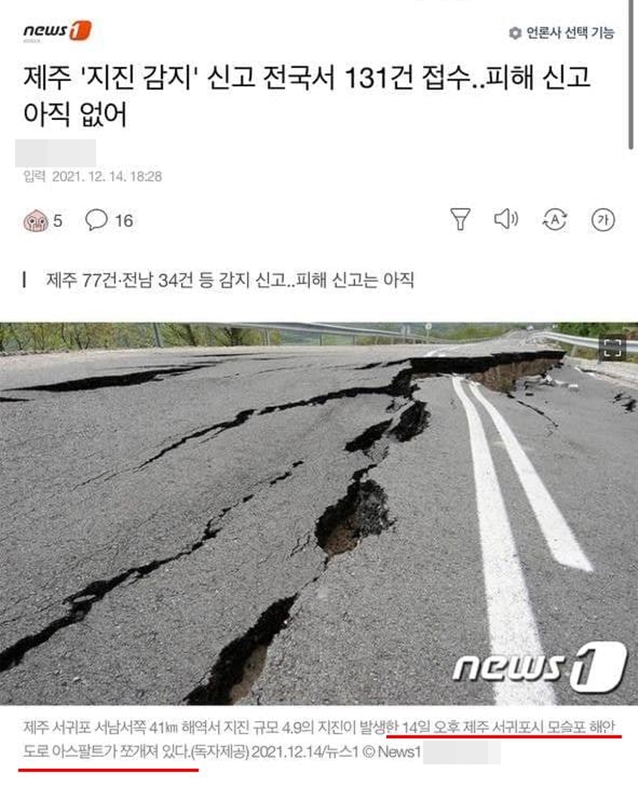 | Subject | 제주 지진 ‘갈라진도로’? 오보 사진이 신문1면까지 |