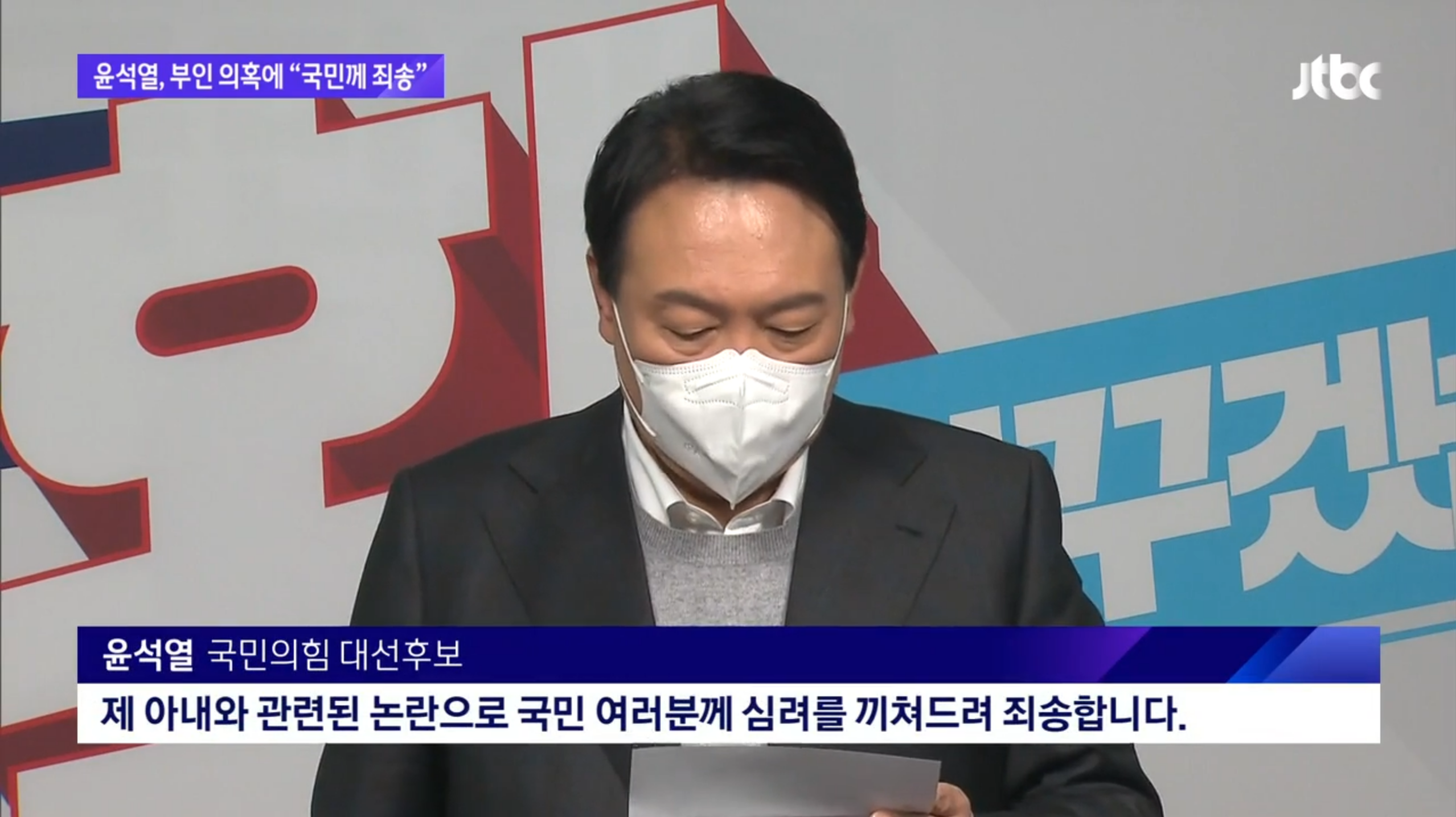 | Subject | '부인 의혹' 사과한 윤석열, A4 입장문 읽고 질문 안 받아 |